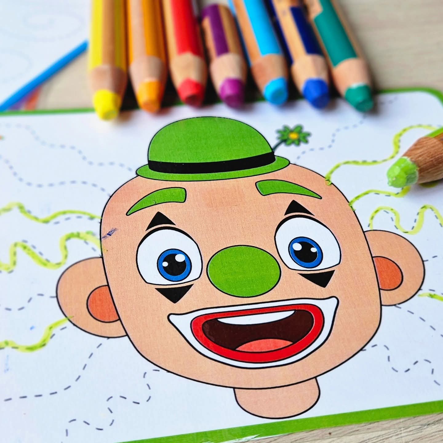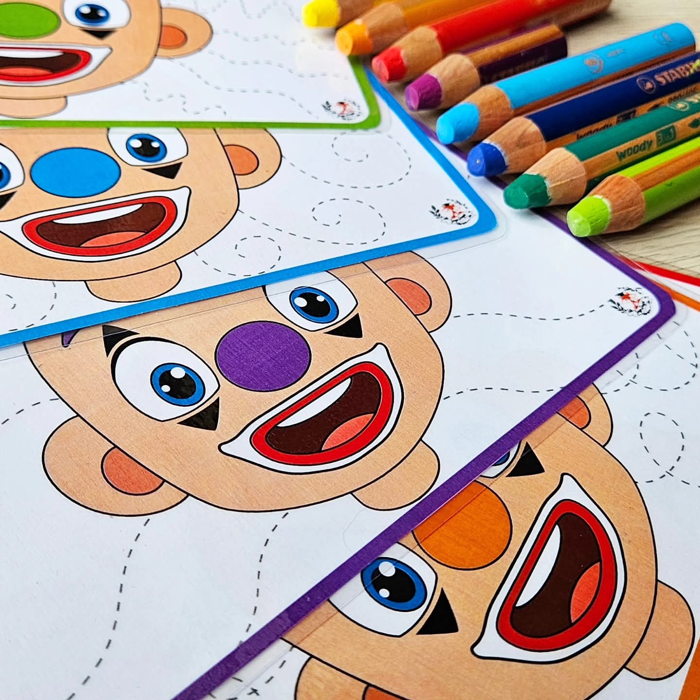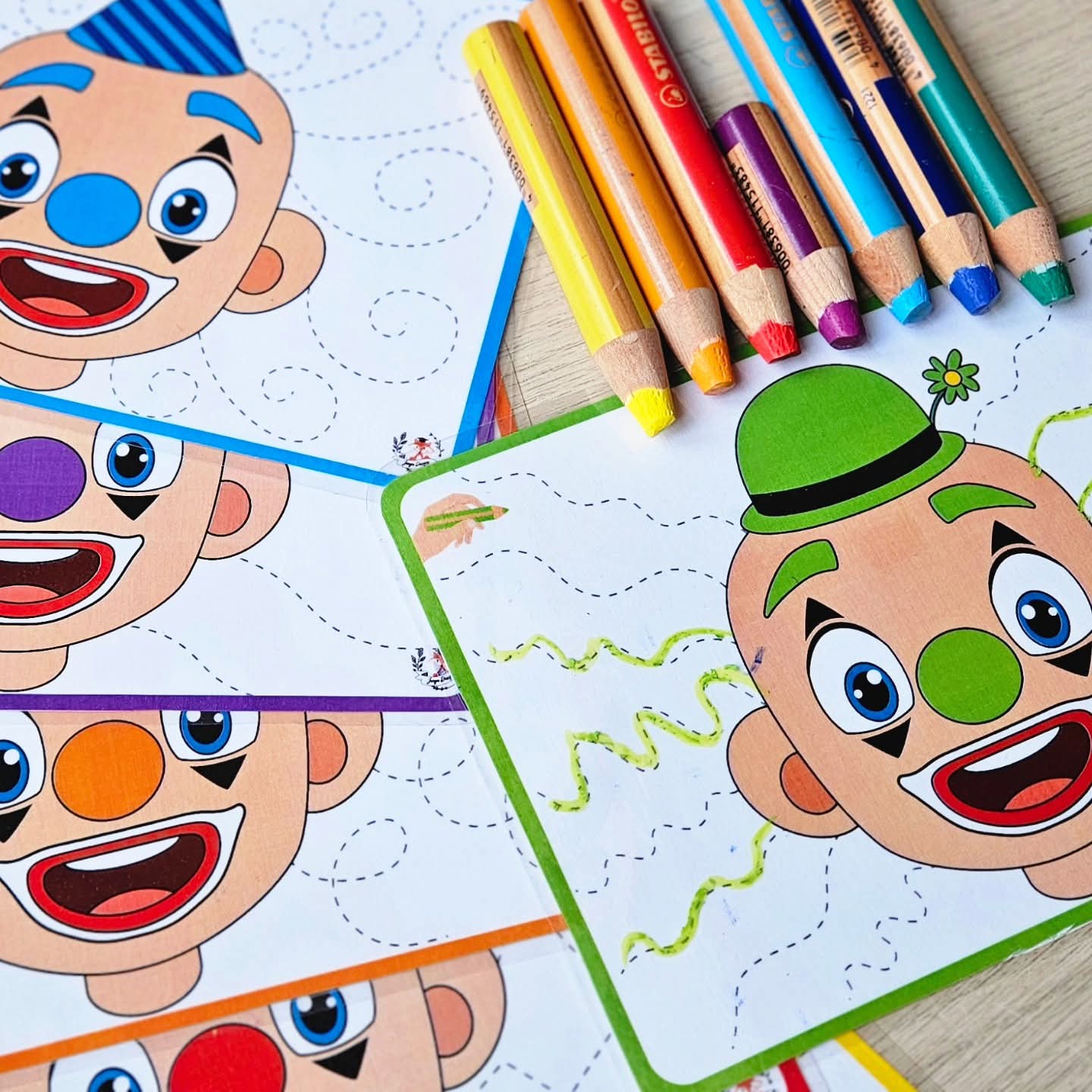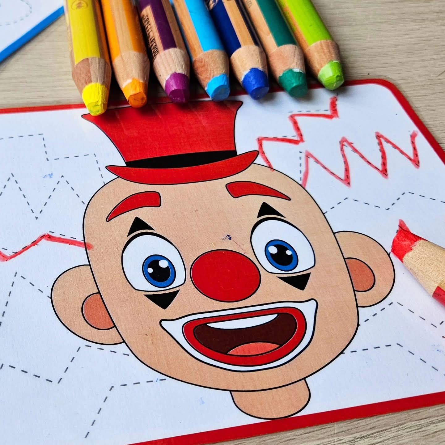 The last part consists of the clowns in black-and-white illustration with the writing pattern lines in dotted lines. Let the children trace the writing pattern hair themselves and give the clown nice cheerful colors. They can even color it in completely.