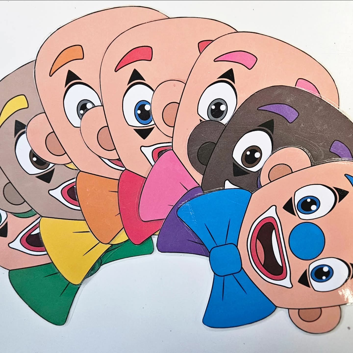 - 7 separate bare clown heads in various colors