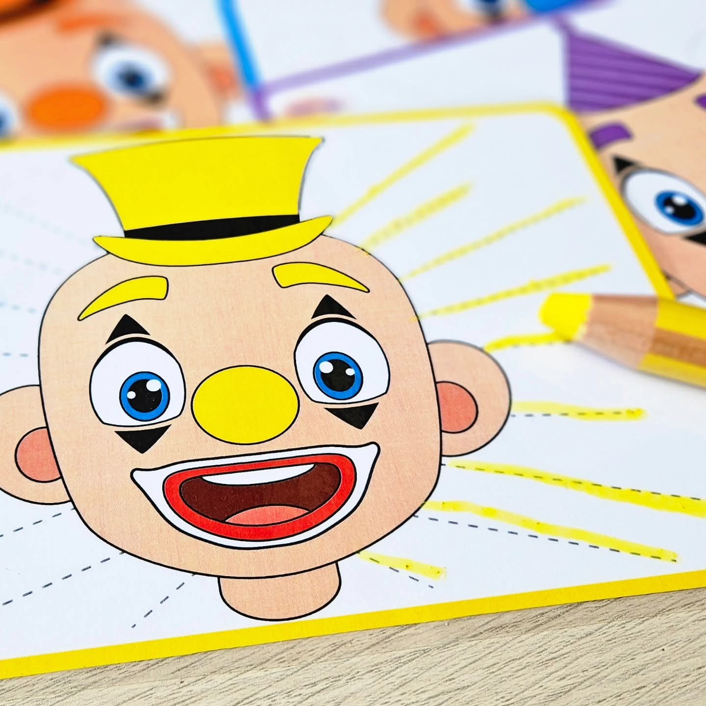 This includes 3 types of files. Good for working progressively from three-dimensional to paper. You will receive the separate bare clown heads to use for example in writing dance or as a free assignment. Some examples: drawing hair on the table with Woody wax crayons, shaping hair patterns with shaving foam above the heads, drawing hair around on whiteboards or chalkboards, etc.