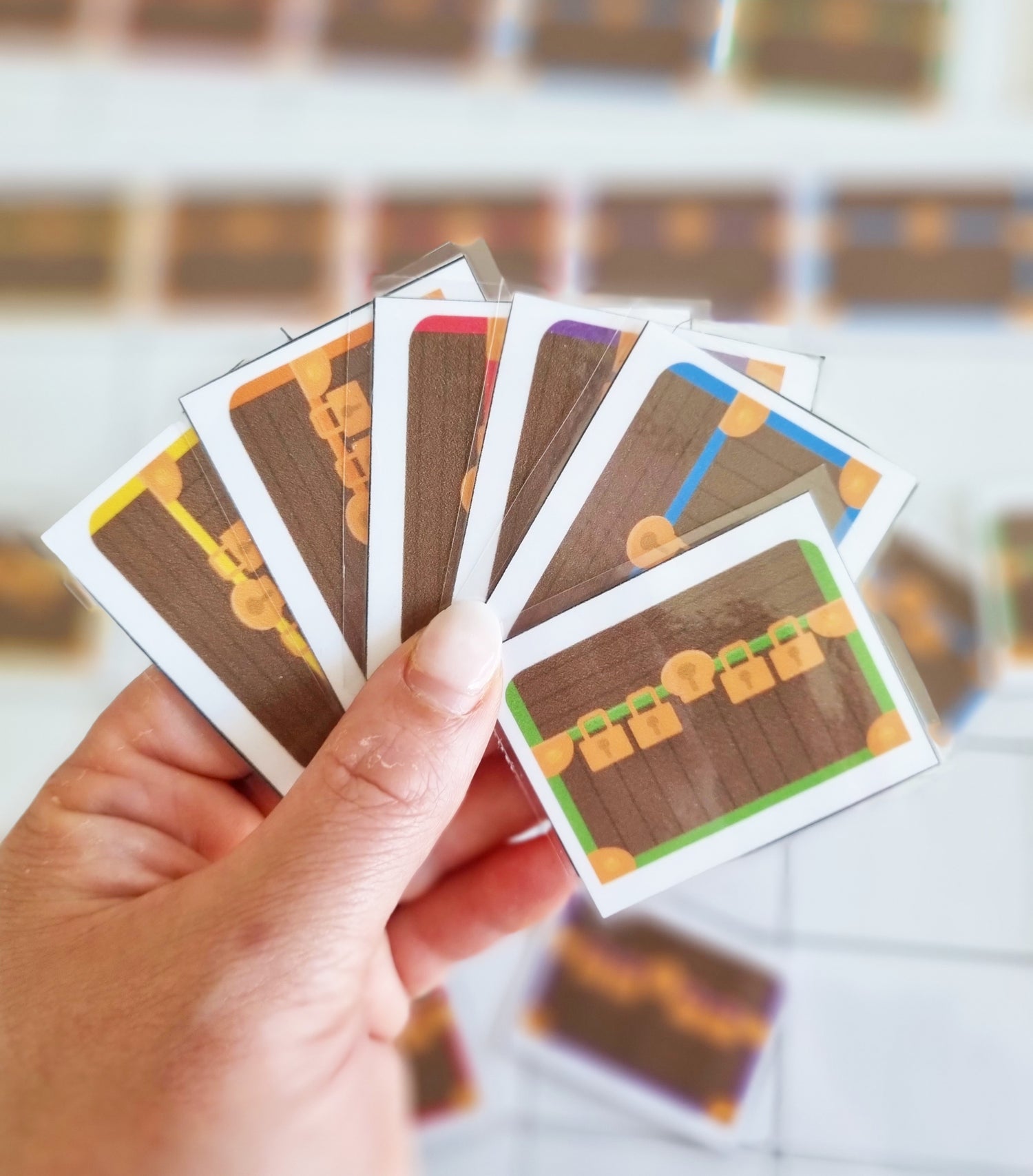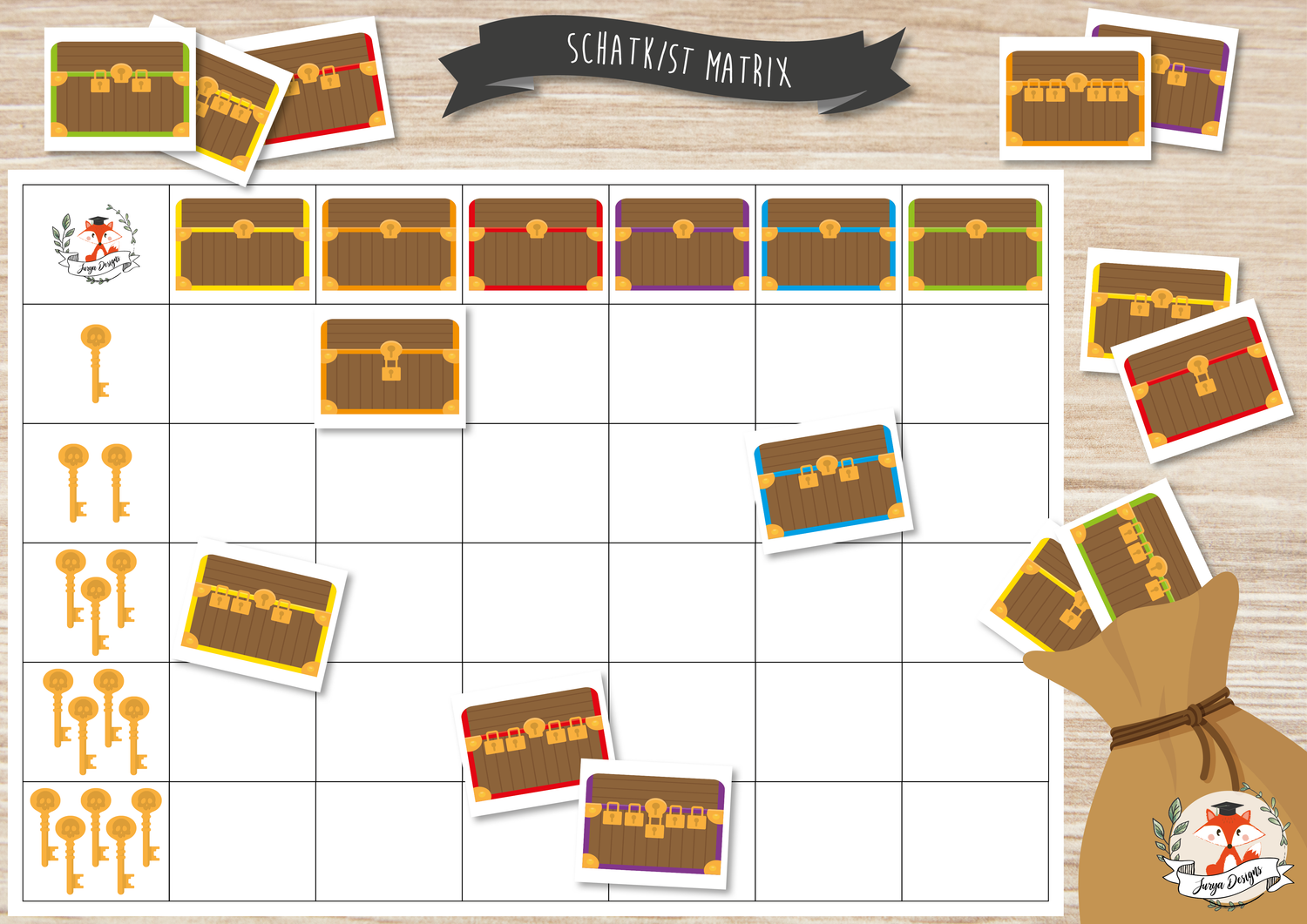 This game can be played with 2-4. Each player takes a matrix board. Each in turn you grab a treasure chest card from the feel bag. Take a good look at your matrix card, where does this card fit? If you don't have them yet, you can put the treasure chest in the right place in the rows. Look and count the locks on the treasure chest, now count the spaces with pirate locks. Next to which number of keys does the card fit and under which color? Now find the right place in the right row. If you already have this card, put it back in the bag and your turn is over. Be the first to fill your entire matrix and you'll be the winner! Aaargh you managed to open all the treasure chests and rob the loot! You can also offer this matrix as an independent activity instead of a game.