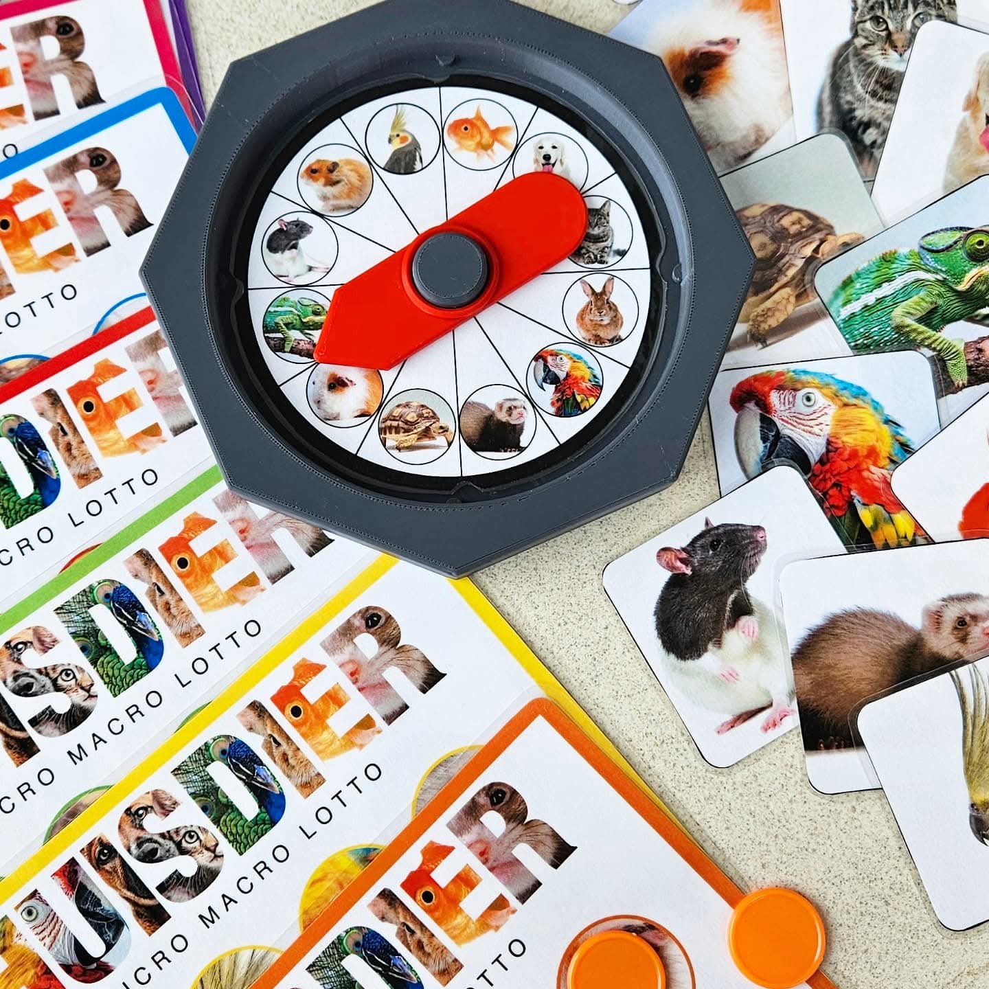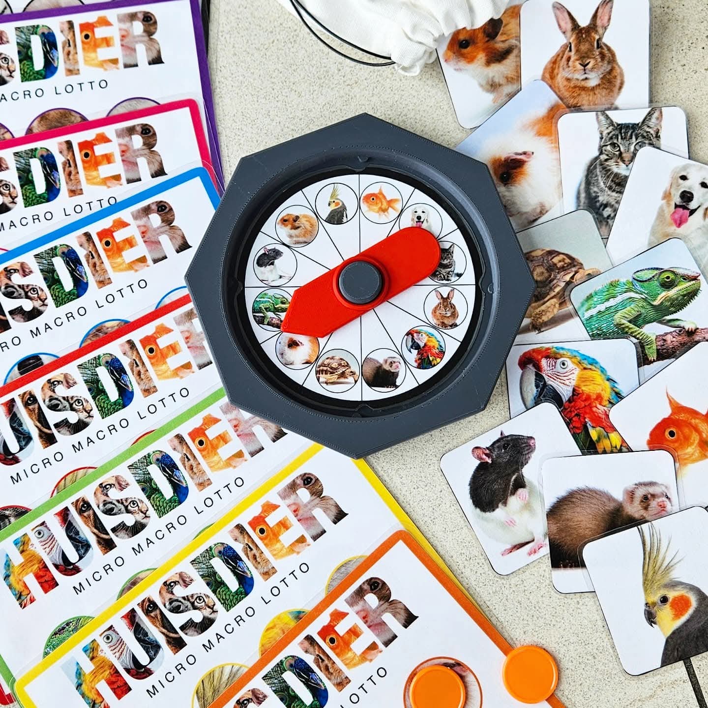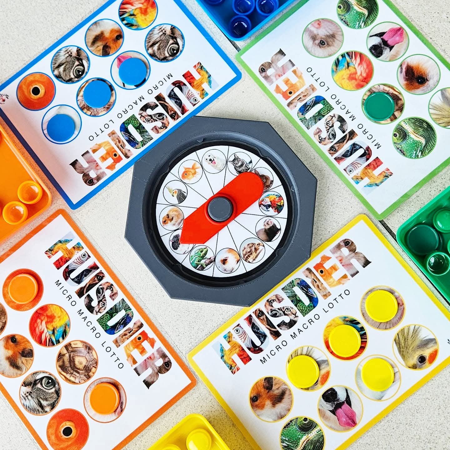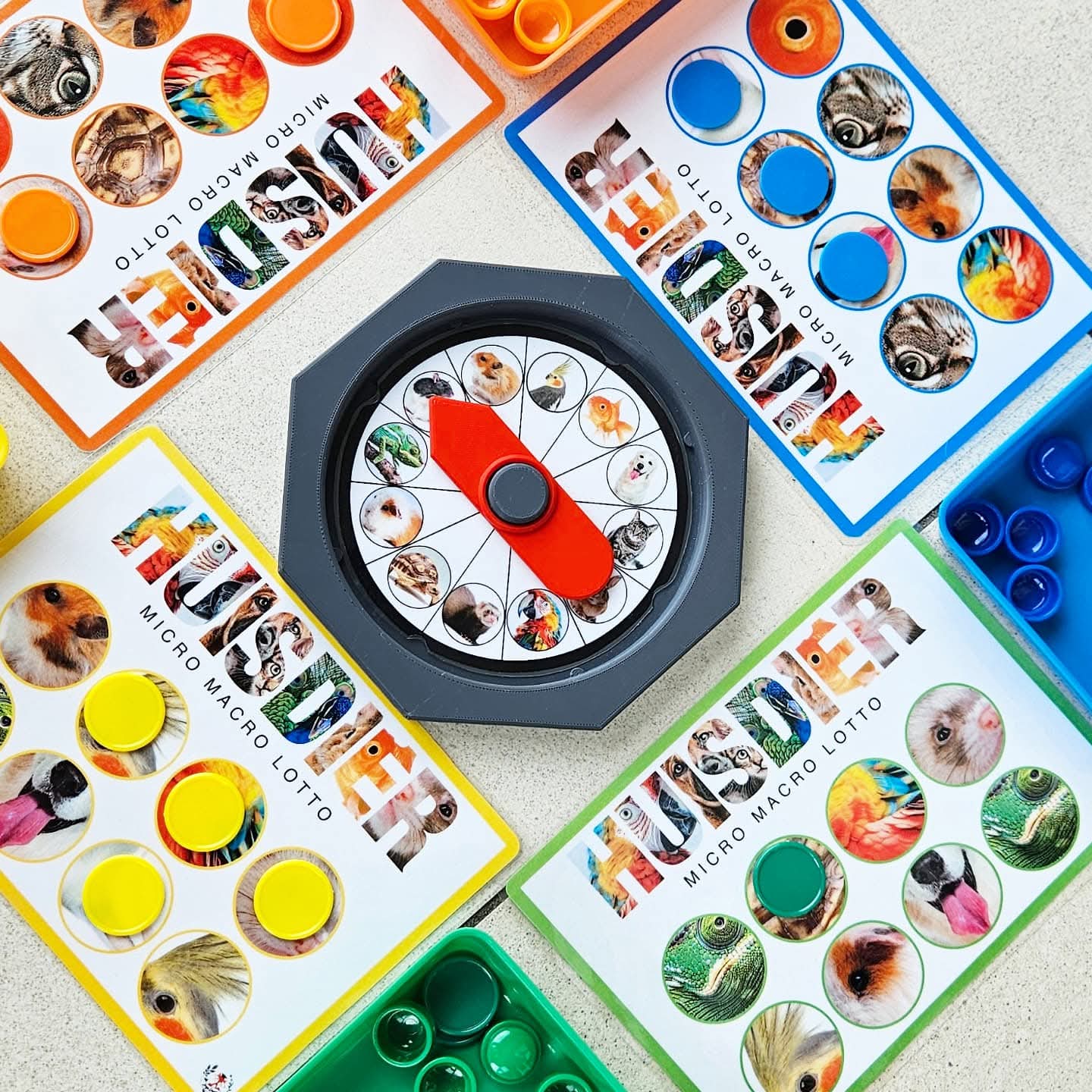 Ce jeu peut se jouer avec 2 à 8 enfants d'âge préscolaire. Chaque joueur choisit une couleur de carte de loto Micro-Macro. Tournez la roue ou utilisez le C-spinner. Ou piochez chacun à votre tour une carte d'animal dans le sac sensoriel. Regardez bien et nommez l'animal domestique. À quoi ressemble cet animal ? Observez ses caractéristiques extérieures comme les couleurs, les oreilles, le nez, les yeux, le type de pelage, les écailles, les plumes ou la carapace ? L'objectif de la caméra est agrandi et sur votre carte, un zoom très rapproché est fait sur une partie de l'animal domestique. Voyez-vous sur votre carte de loto un cercle avec des caractéristiques en gros plan correspondant à cet animal ? Si oui, vous pouvez y placer un (bouchon ou disque). (Comme matériel de couverture, vous pouvez utiliser diverses choses par ex. : disques Grapat, bouchons de bouteilles, jetons colorés, etc.) Sinon, votre tour passe. Nous cherchons une partie correspondant à un tout ! Le premier qui remplit sa carte de loto et a pu associer toutes les photos Micro-Macro gagne. Bien joué, vous connaissez bien tous les animaux domestiques.