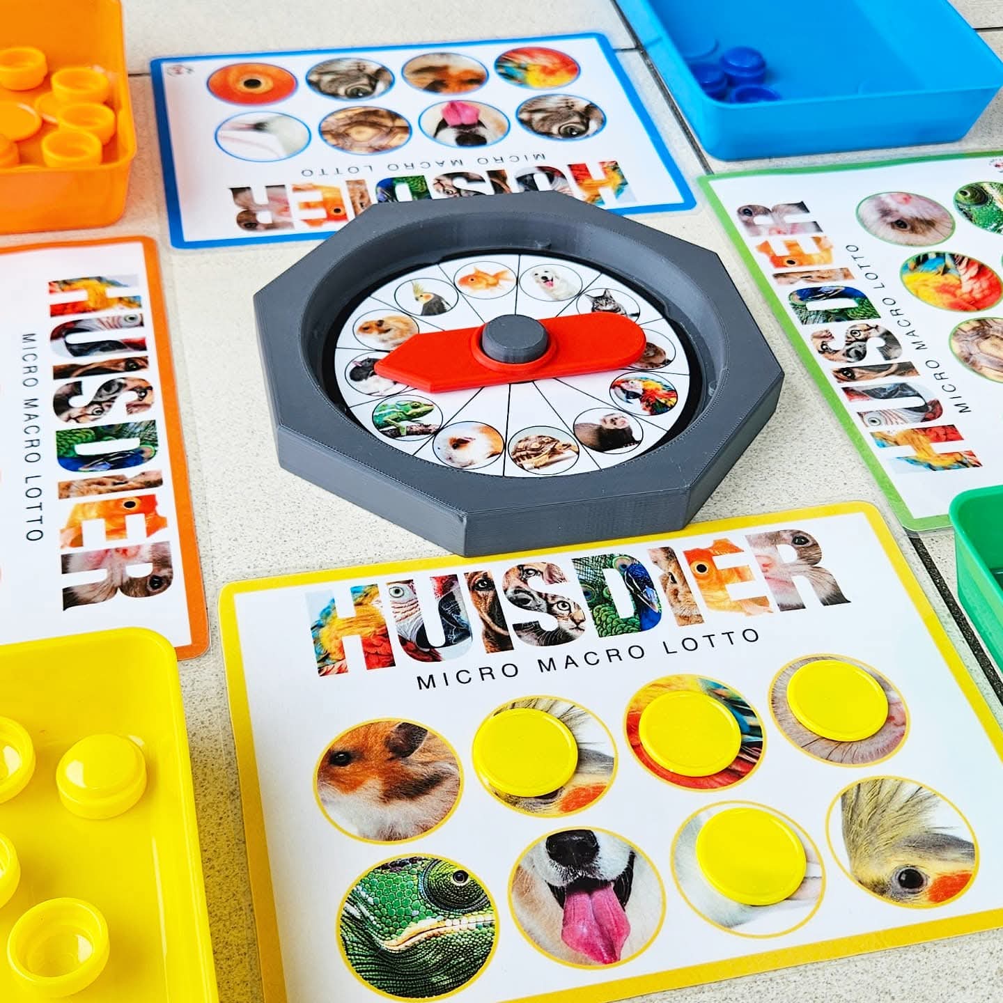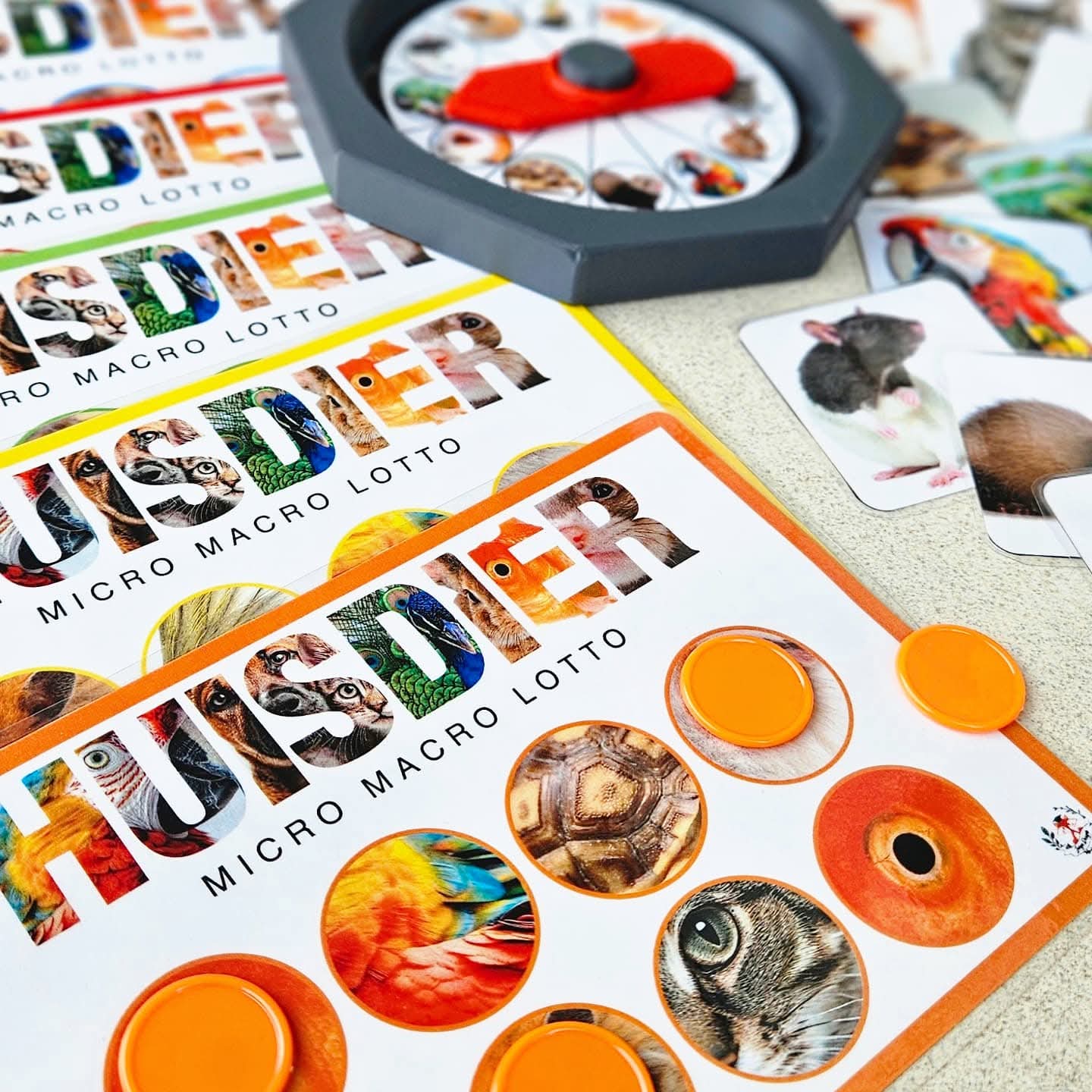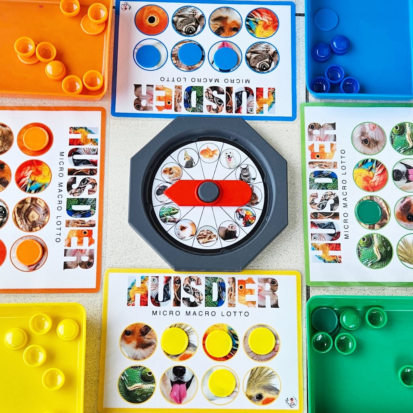 Ce jeu peut se jouer avec 2 à 8 enfants d'âge préscolaire. Chaque joueur choisit une couleur de carte de loto Micro-Macro. Tournez la roue ou utilisez le C-spinner. Ou piochez chacun à votre tour une carte d'animal dans le sac sensoriel. Regardez bien et nommez l'animal domestique. À quoi ressemble cet animal ? Observez ses caractéristiques extérieures comme les couleurs, les oreilles, le nez, les yeux, le type de pelage, les écailles, les plumes ou la carapace ? L'objectif de la caméra est agrandi et sur votre carte, un zoom très rapproché est fait sur une partie de l'animal domestique. Voyez-vous sur votre carte de loto un cercle avec des caractéristiques en gros plan correspondant à cet animal ? Si oui, vous pouvez y placer un (bouchon ou disque). (Comme matériel de couverture, vous pouvez utiliser diverses choses par ex. : disques Grapat, bouchons de bouteilles, jetons colorés, etc.) Sinon, votre tour passe. Nous cherchons une partie correspondant à un tout ! Le premier qui remplit sa carte de loto et a pu associer toutes les photos Micro-Macro gagne. Bien joué, vous connaissez bien tous les animaux domestiques.