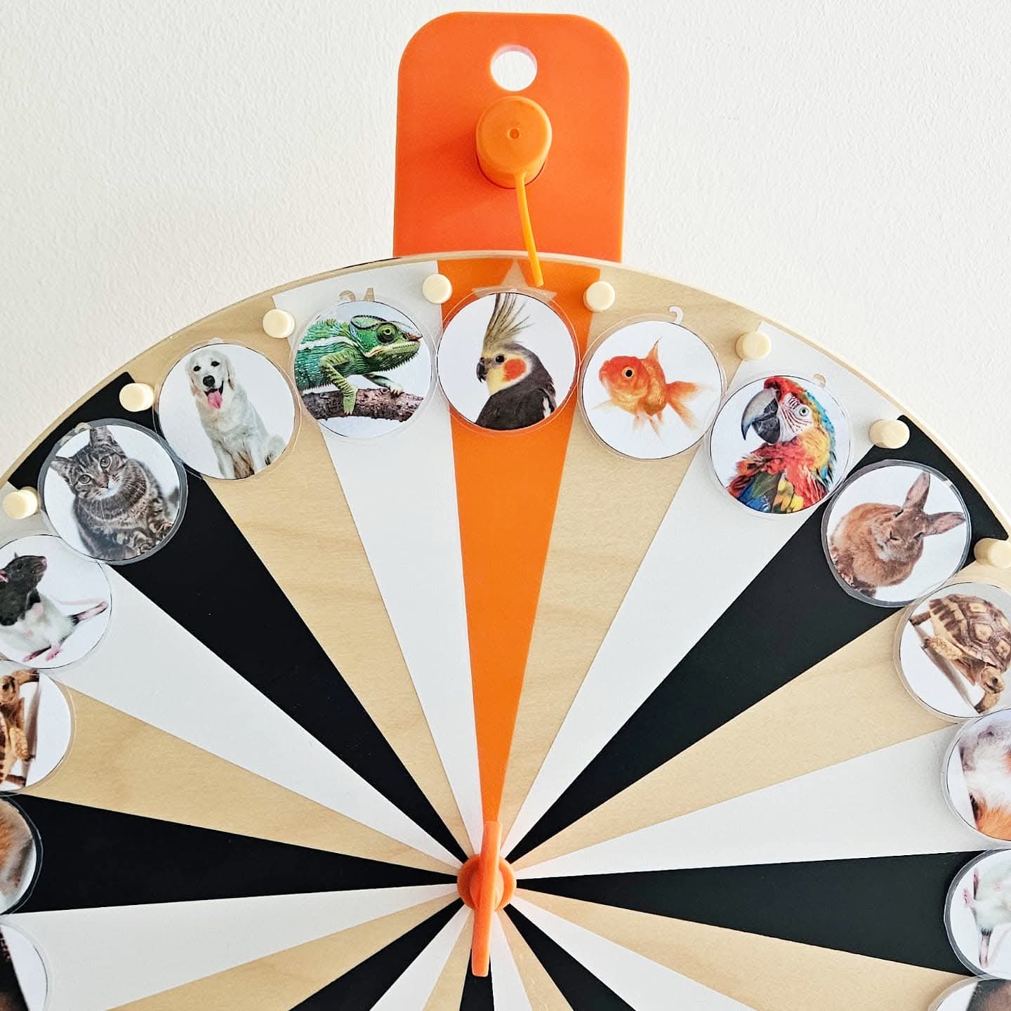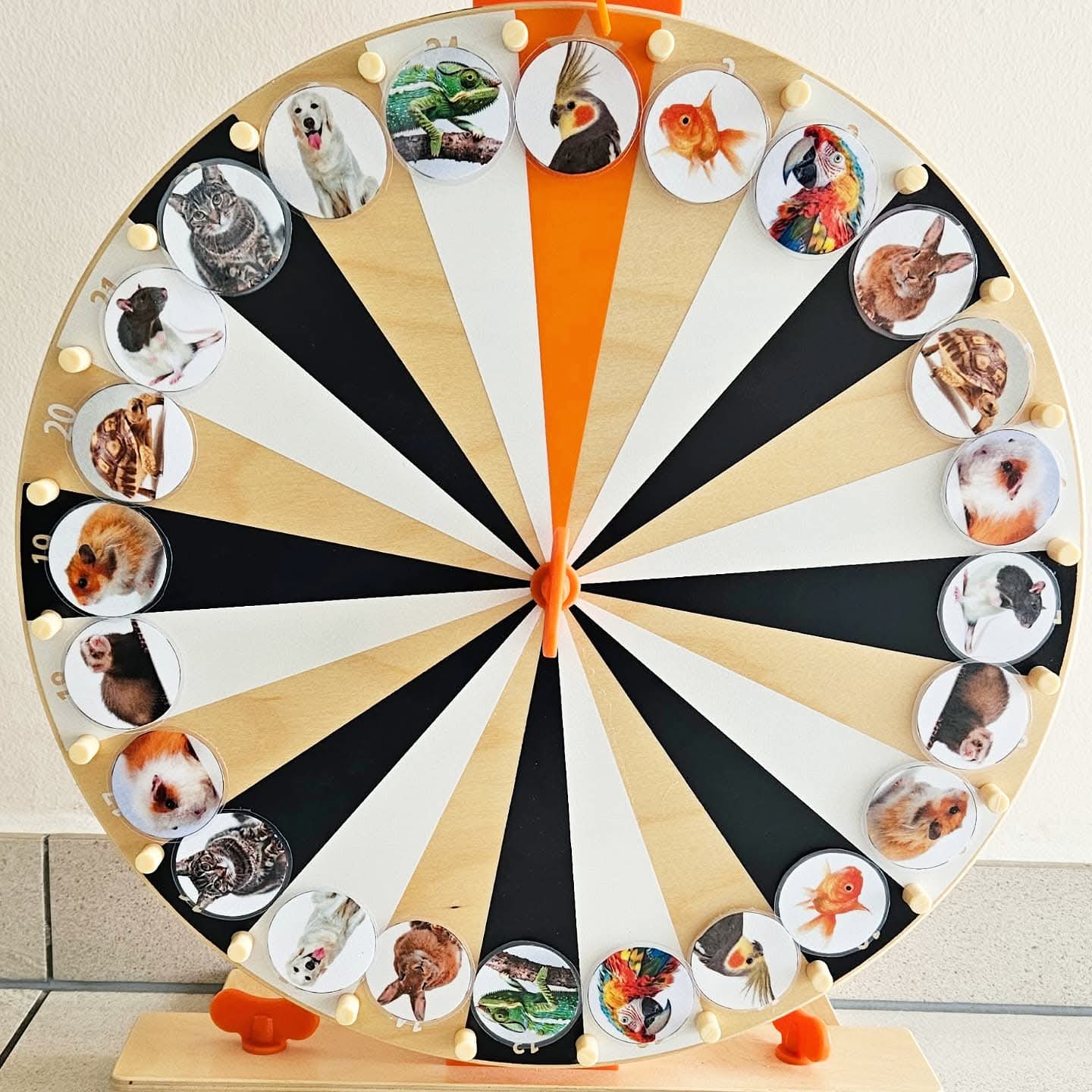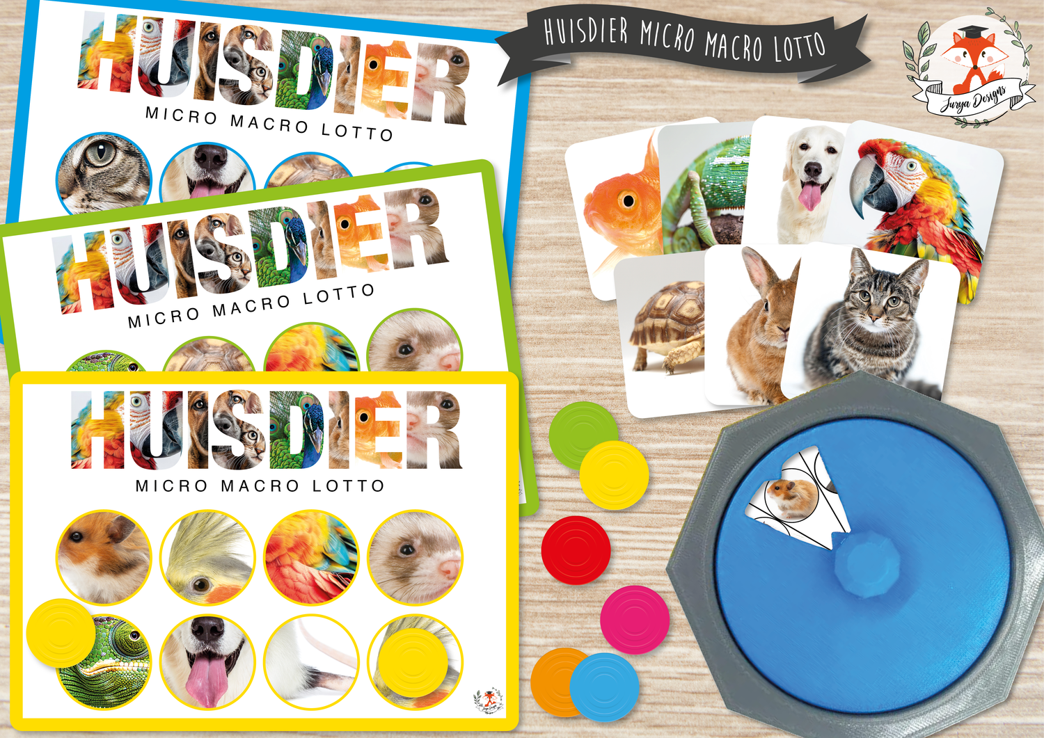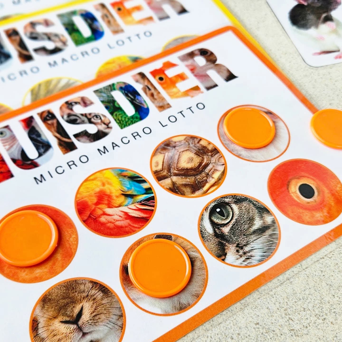 Ce jeu peut se jouer avec 2 à 8 enfants d'âge préscolaire. Chaque joueur choisit une couleur de carte de loto Micro-Macro. Tournez la roue ou utilisez le C-spinner. Ou piochez chacun à votre tour une carte d'animal dans le sac sensoriel. Regardez bien et nommez l'animal domestique. À quoi ressemble cet animal ? Observez ses caractéristiques extérieures comme les couleurs, les oreilles, le nez, les yeux, le type de pelage, les écailles, les plumes ou la carapace ? L'objectif de la caméra est agrandi et sur votre carte, un zoom très rapproché est fait sur une partie de l'animal domestique. Voyez-vous sur votre carte de loto un cercle avec des caractéristiques en gros plan correspondant à cet animal ? Si oui, vous pouvez y placer un (bouchon ou disque). (Comme matériel de couverture, vous pouvez utiliser diverses choses par ex. : disques Grapat, bouchons de bouteilles, jetons colorés, etc.) Sinon, votre tour passe. Nous cherchons une partie correspondant à un tout ! Le premier qui remplit sa carte de loto et a pu associer toutes les photos Micro-Macro gagne. Bien joué, vous connaissez bien tous les animaux domestiques.