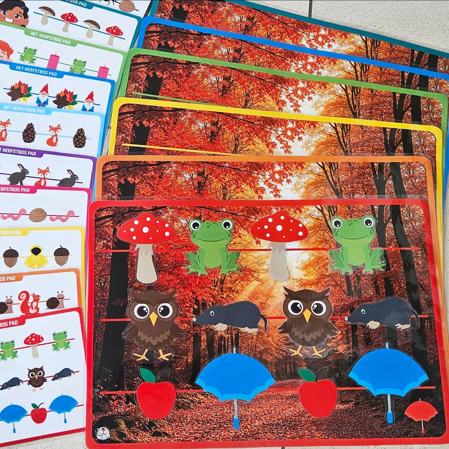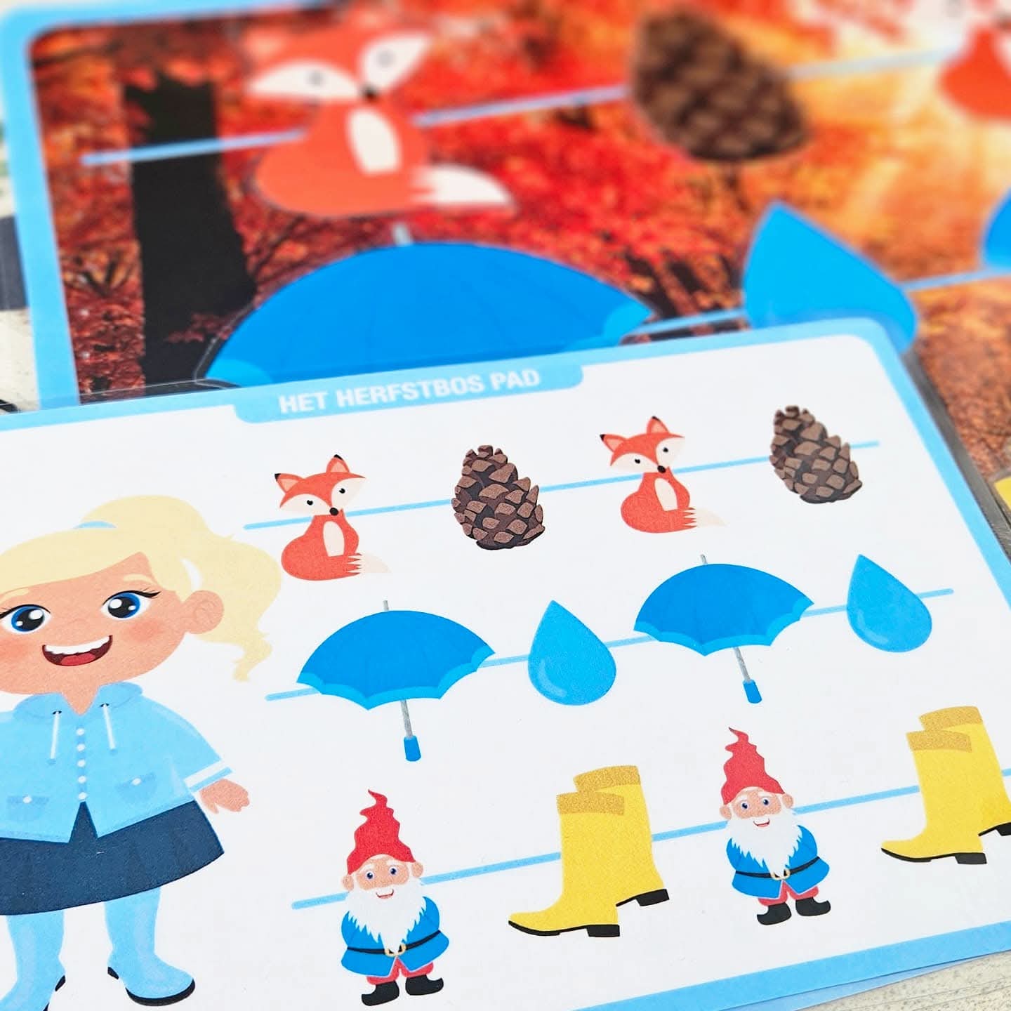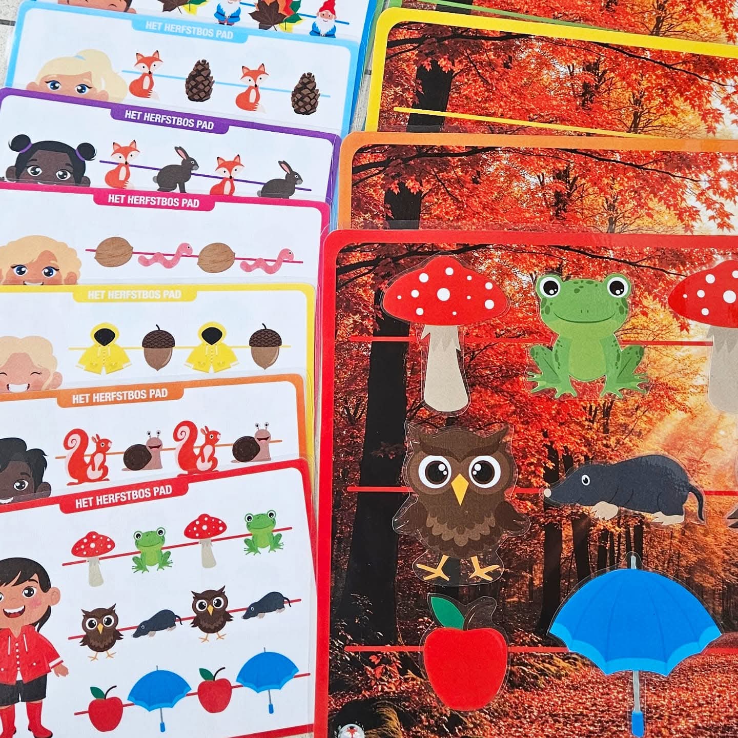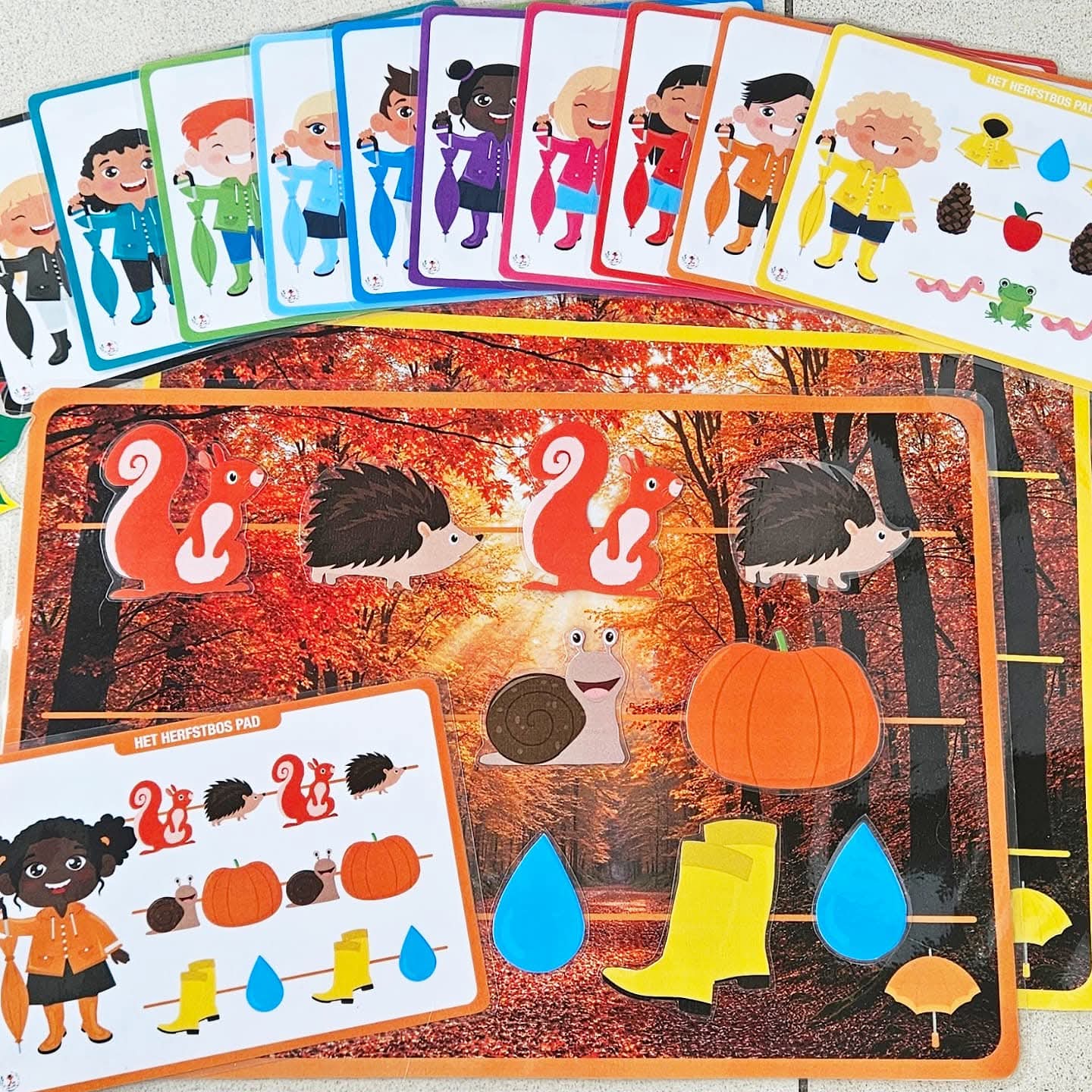 Ce jeu peut se jouer de 2 à 10 joueurs. Nous partons en chasse au trésor d'automne dans la forêt. Mettez tous les objets et animaux d'automne dans un sac tactile ou un bac à attraper. Chaque joueur choisit une carte modèle d'une couleur différente et la grande carte vide de la forêt d'automne. Pour chaque couleur, vous pouvez choisir un garçon ou une fille comme carte de collecte d'automne. Chaque joueur tire à tour de rôle un objet ou un animal d'un bac ou d'un sac. Nommez l'objet ou l'animal d'automne et regardez bien votre carte modèle. Votre enfant a-t-il aussi trouvé cet objet ou animal d'automne dans la forêt ? Si oui, vous pouvez le placer sur la grande carte, sur la même ligne et à la même place dans la rangée que sur la petite carte modèle. Nous allons essayer de rassembler les bonnes combinaisons sur notre grande carte du chemin de la forêt d'automne. Si vous n'avez pas besoin de l'objet ou de l'animal, remettez-le dans le sac ou le bac. Ce tour, vous n'avez malheureusement pas trouvé les bons objets à collecter. Continuez ainsi jusqu'à ce qu'un joueur ait rassemblé tous les objets ou animaux d'automne, complets comme sur la carte modèle. Vous êtes le meilleur détective d'automne du chemin de la forêt d'automne.