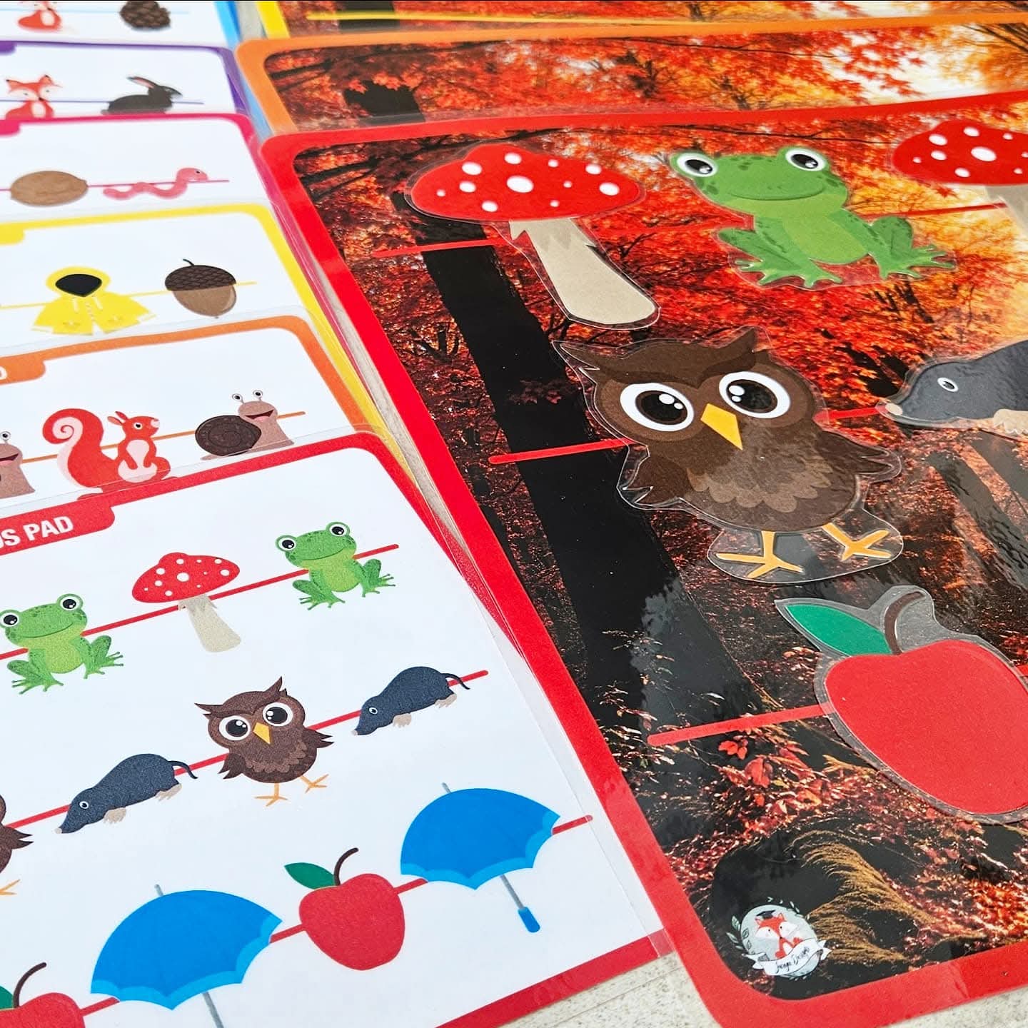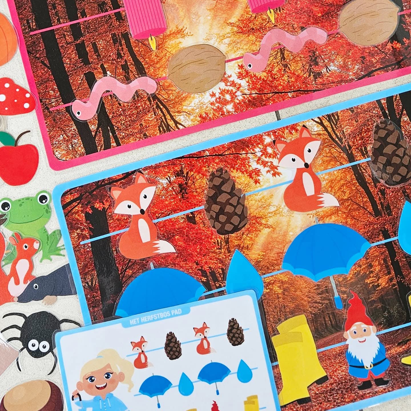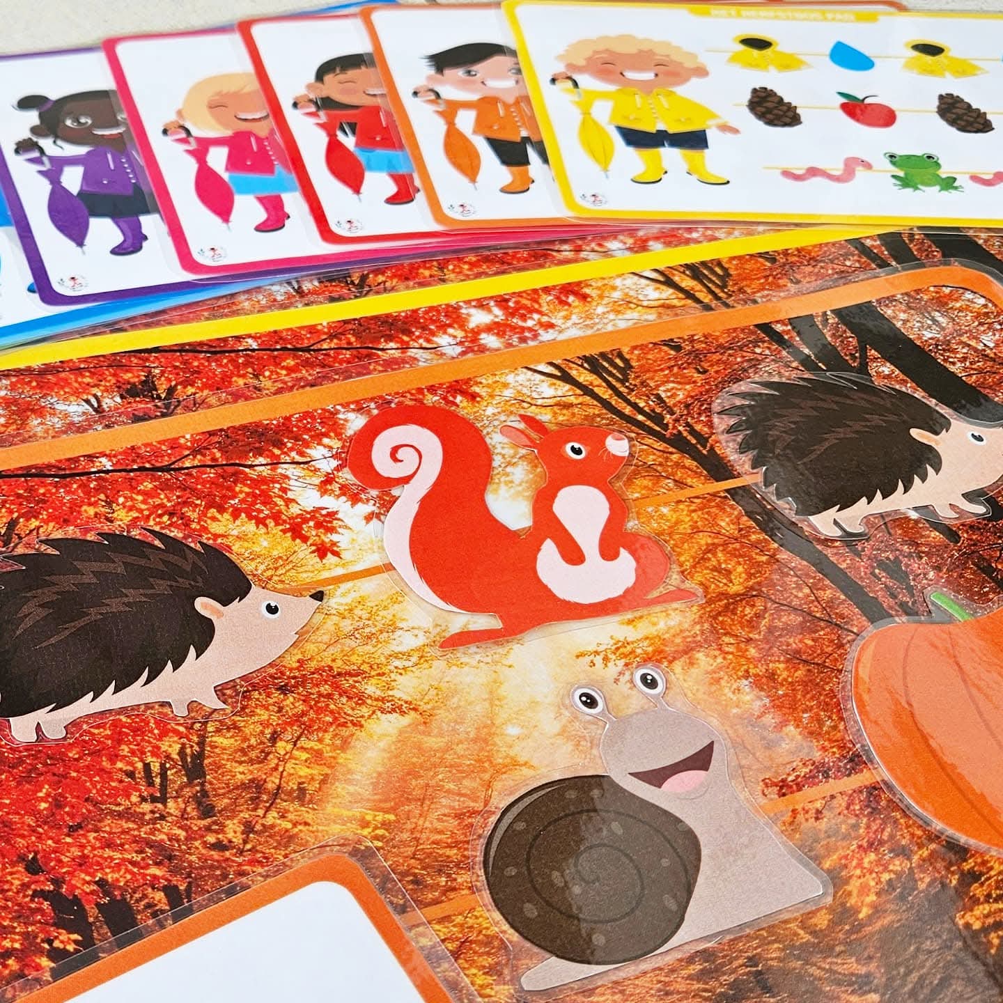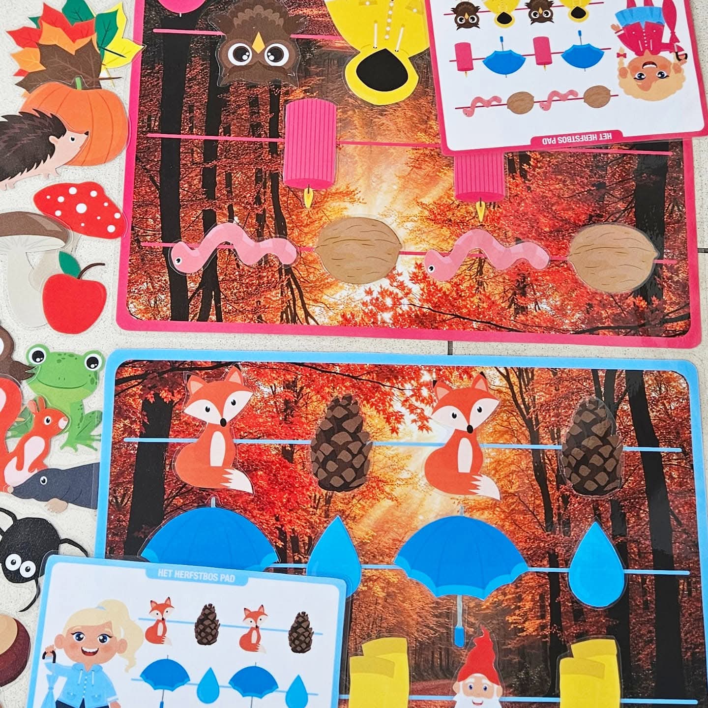Ce jeu peut se jouer de 2 à 10 joueurs. Nous partons en chasse au trésor d'automne dans la forêt. Mettez tous les objets et animaux d'automne dans un sac tactile ou un bac à attraper. Chaque joueur choisit une carte modèle d'une couleur différente et la grande carte vide de la forêt d'automne. Pour chaque couleur, vous pouvez choisir un garçon ou une fille comme carte de collecte d'automne. Chaque joueur tire à tour de rôle un objet ou un animal d'un bac ou d'un sac. Nommez l'objet ou l'animal d'automne et regardez bien votre carte modèle. Votre enfant a-t-il aussi trouvé cet objet ou animal d'automne dans la forêt ? Si oui, vous pouvez le placer sur la grande carte, sur la même ligne et à la même place dans la rangée que sur la petite carte modèle. Nous allons essayer de rassembler les bonnes combinaisons sur notre grande carte du chemin de la forêt d'automne. Si vous n'avez pas besoin de l'objet ou de l'animal, remettez-le dans le sac ou le bac. Ce tour, vous n'avez malheureusement pas trouvé les bons objets à collecter. Continuez ainsi jusqu'à ce qu'un joueur ait rassemblé tous les objets ou animaux d'automne, complets comme sur la carte modèle. Vous êtes le meilleur détective d'automne du chemin de la forêt d'automne.