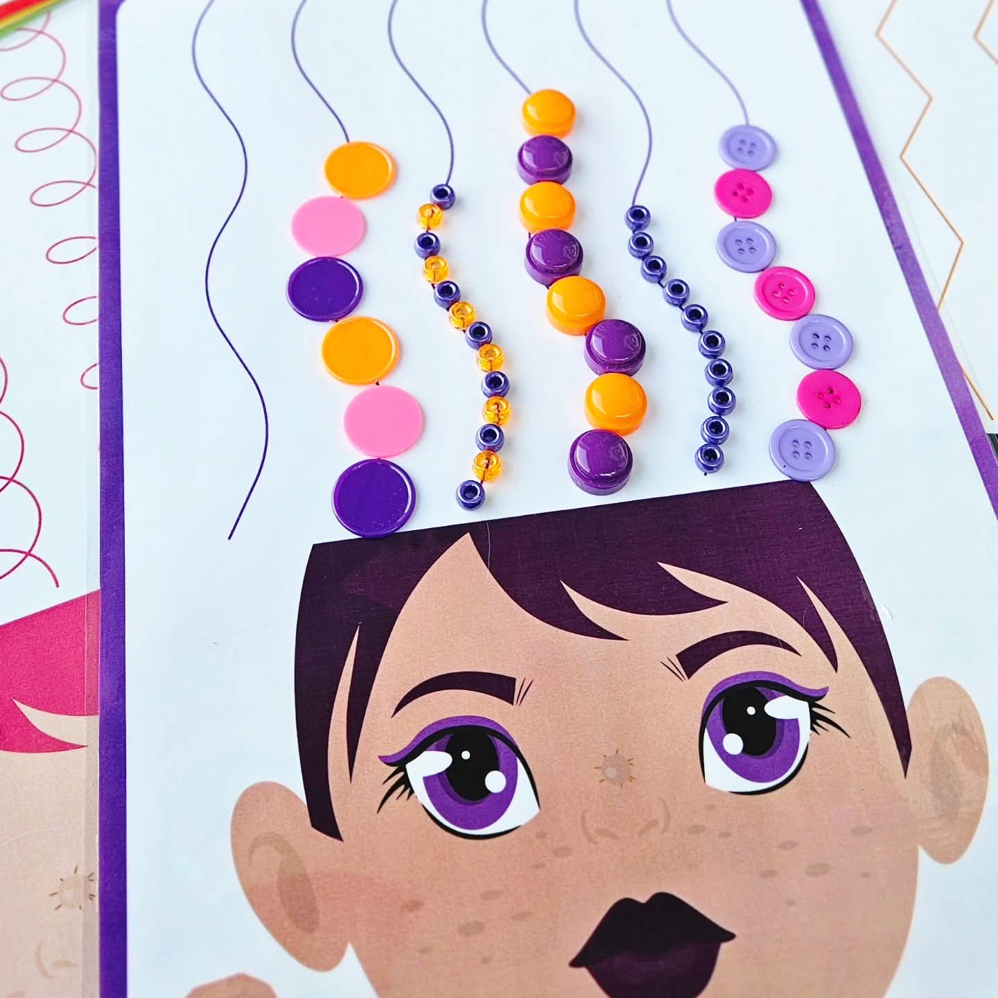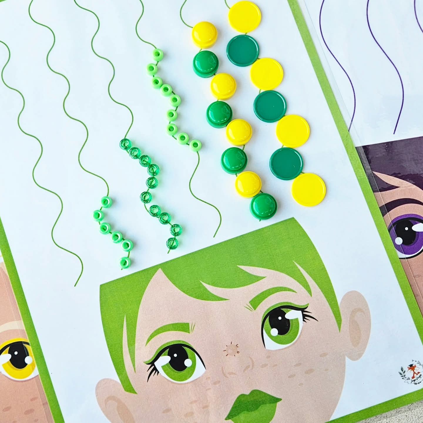 Vous recevez également de grandes images (impression A3) avec les cheveux de sorcière en diverses formes de lignes : bouclées, raides, ondulées, anguleuses, etc.. Ces cartes peuvent être proposées avec divers matériaux loose-parts pour permettre aux enfants d'expérimenter librement et de remplir les lignes. Vous pouvez aussi faire cela avec une tâche approfondie, par exemple : en motifs ! Les matériaux utilisés sont par exemple : boutons, bouchons empilables, perles, perles, fiches magnétiques, pailles, pompons, etc..