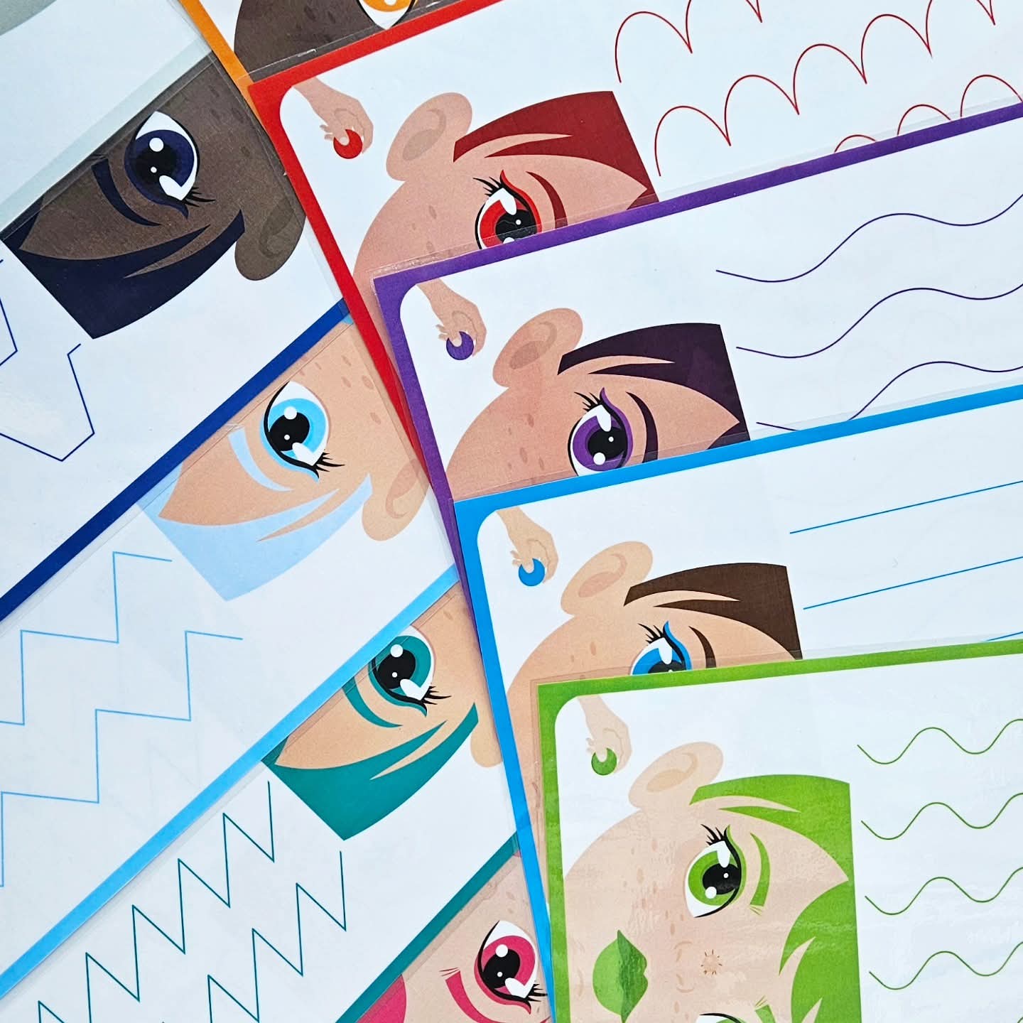 Vous recevez les cartes de motifs d'écriture. Vous pouvez tracer les cheveux sur la ligne pointillée avec par exemple des crayons Woody, des pastels gras ou un marqueur pour tableau blanc. Utilisez les motifs en soutien lors de la première partie ou avec un tableau noir.