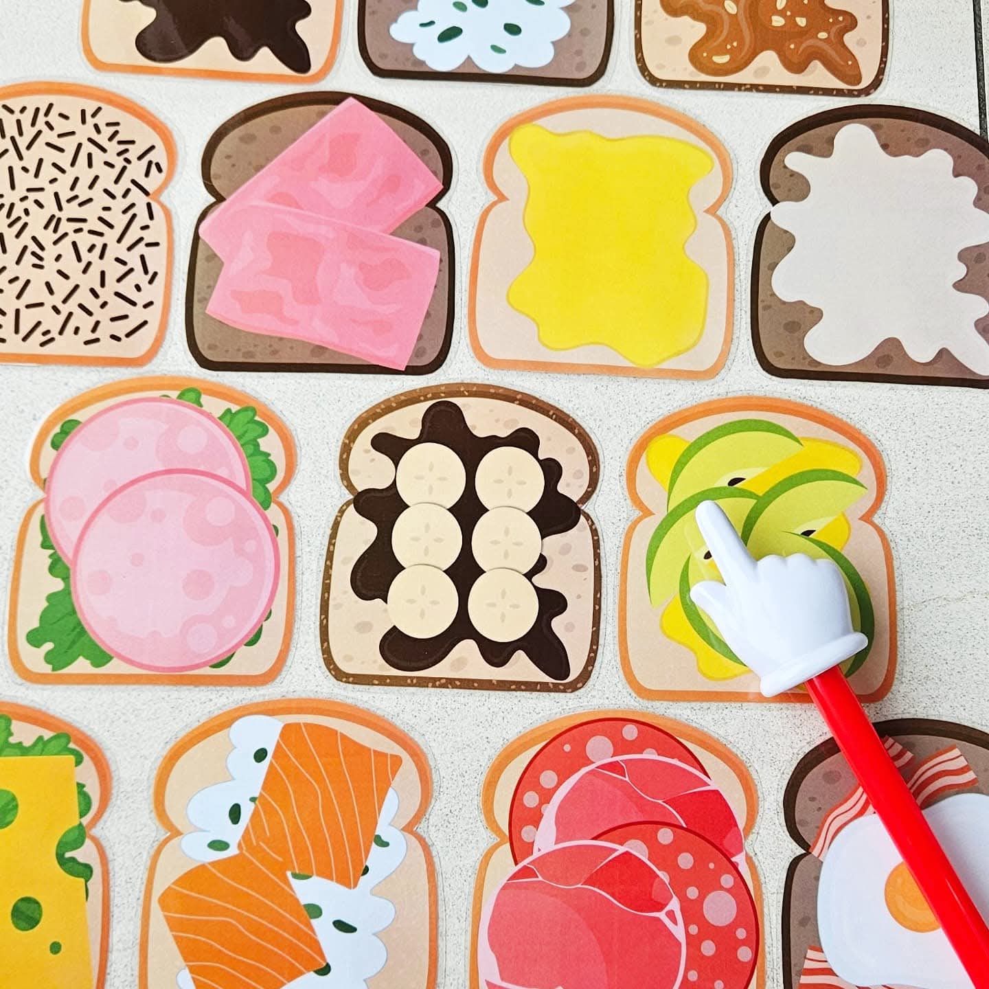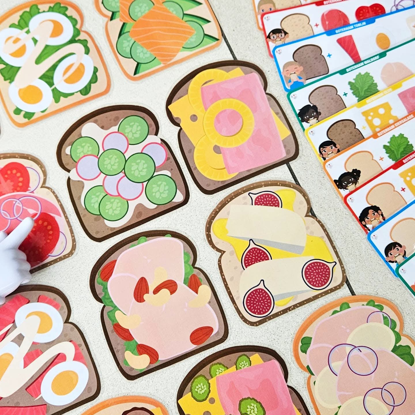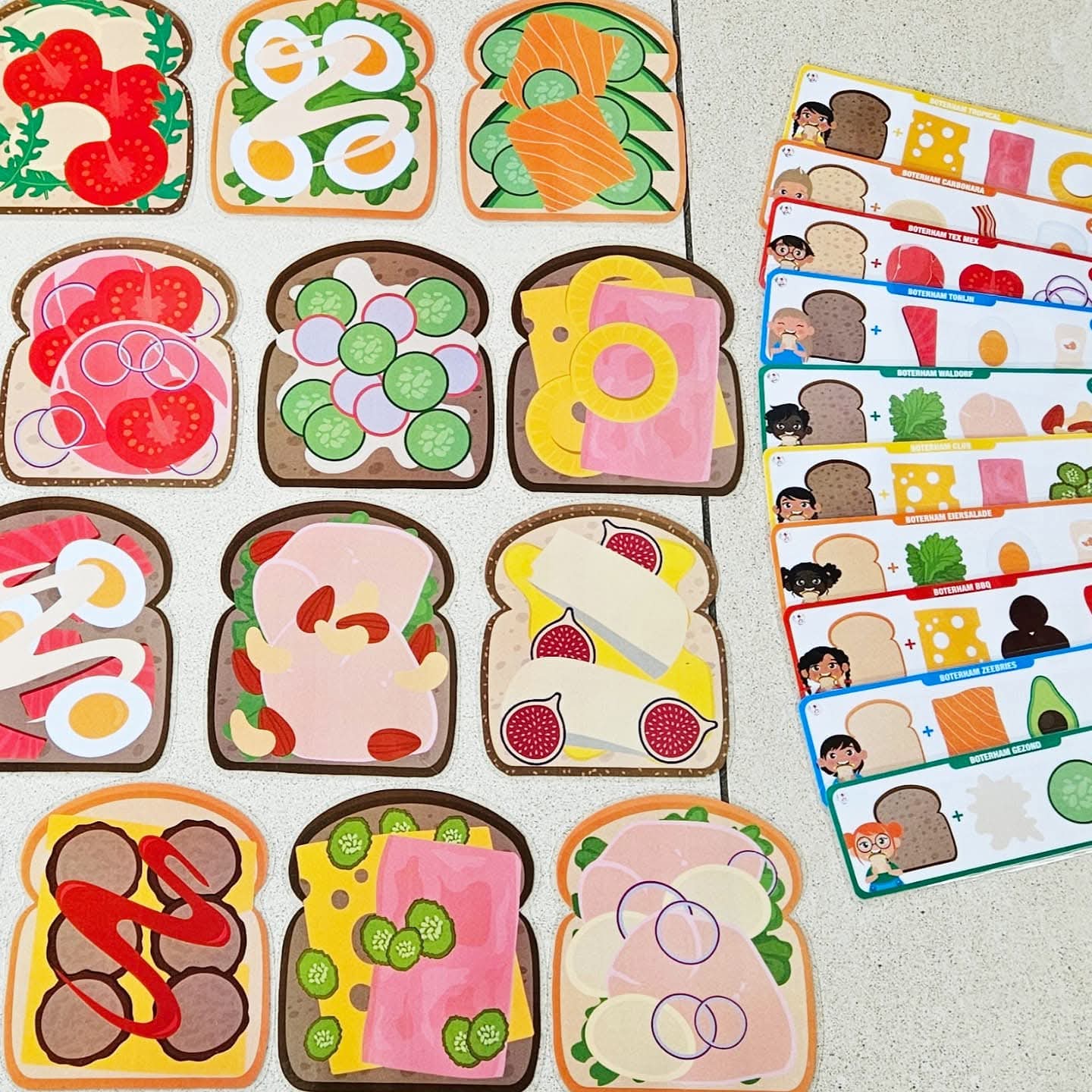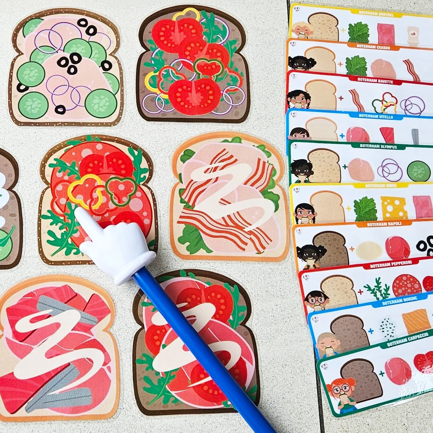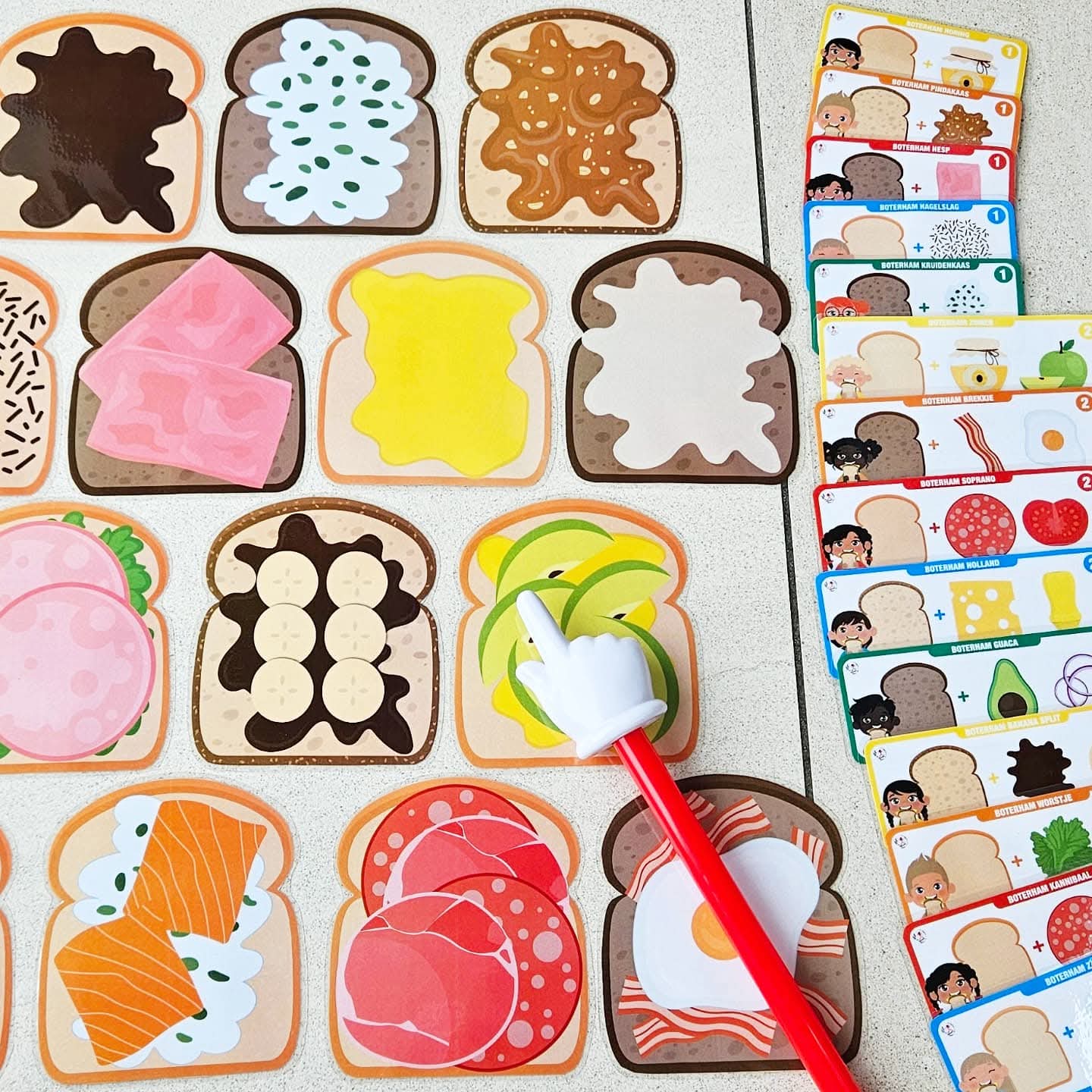 Ce jeu se joue de 2 à 4 joueurs. Tu peux proposer le jeu avec des combinaisons de 1, 2, 3 ou 4 ingrédients sur le sandwich (pain blanc, multicéréales ou complet). Choisis avec combien tu souhaites jouer. Par exemple : 1. sandwich avec pâte à tartiner au chocolat, 2. salade avec fromage, 3. bacon et mozzarella avec œuf, 4. fromage aux herbes, saumon et concombres avec roquette. Tous les sandwichs sont dispersés sur la table. Fais une pile avec les cartes combinaison et place-la face cachée sur la table. À chaque tour, quelqu’un (ou le maître/la maîtresse) retourne la carte combinaison du dessus. (Ou laisse-les piocher une carte dans un sac tactile ou une boîte à pain). Cherchez tous ensemble très vite le sandwich avec la bonne combinaison d’ingrédients. Tu vois le bon sandwich ? Sprint vite avec ta main et pose ta main sur le sandwich ! (Ou joue avec une baguette à doigt). Si ta main est la première sur le bon sandwich, tu peux garder ce sandwich et la carte combinaison correspondante. Continue ainsi jusqu’à ce que tous les sandwichs soient pris. Compte maintenant les sandwichs, qui en a ramassé le plus ? Qui a été le sprinteur de sandwichs le plus rapide ? C’est le gagnant de ce jeu. Tu es prêt pour la nouvelle année scolaire.