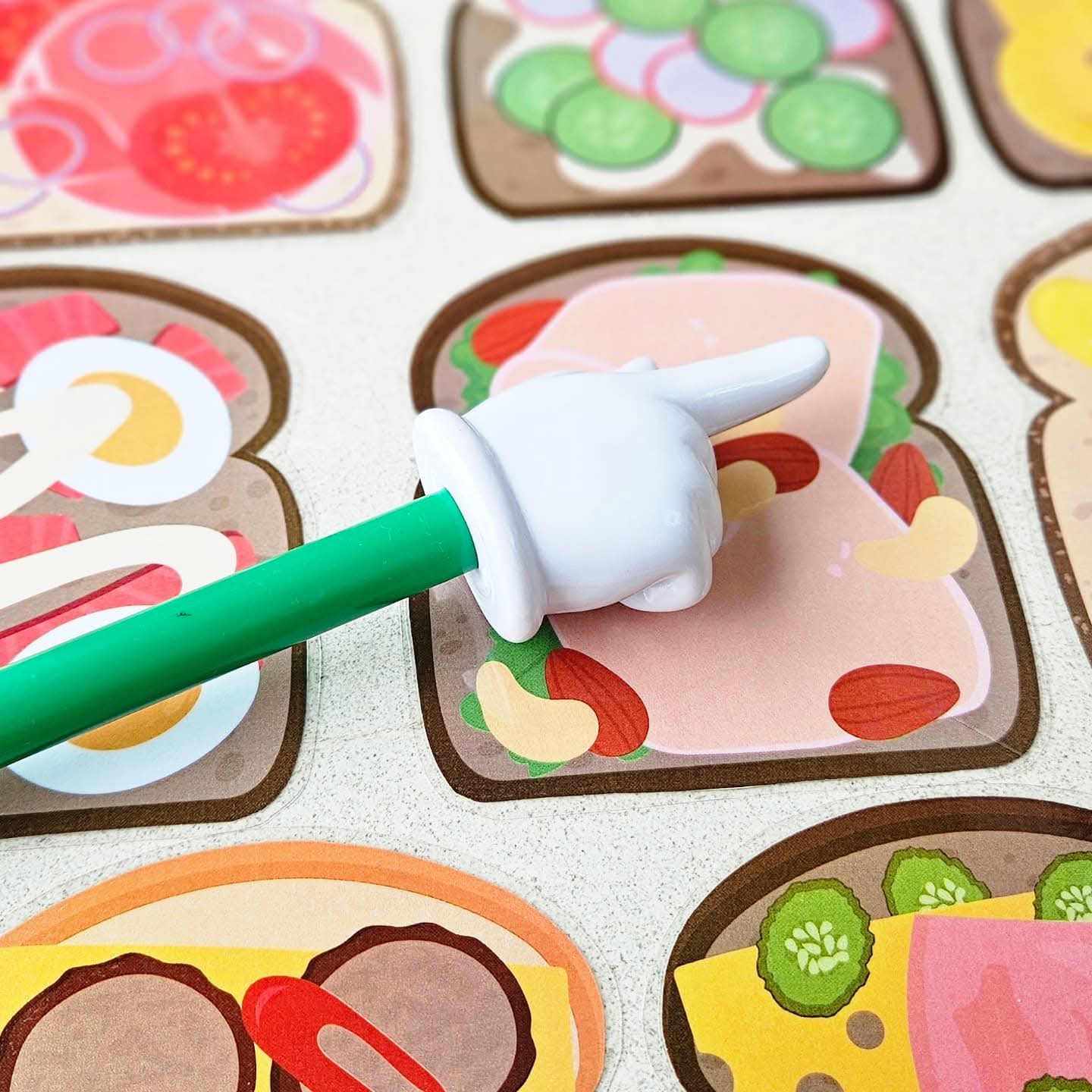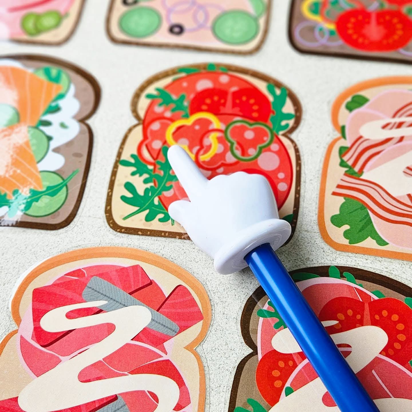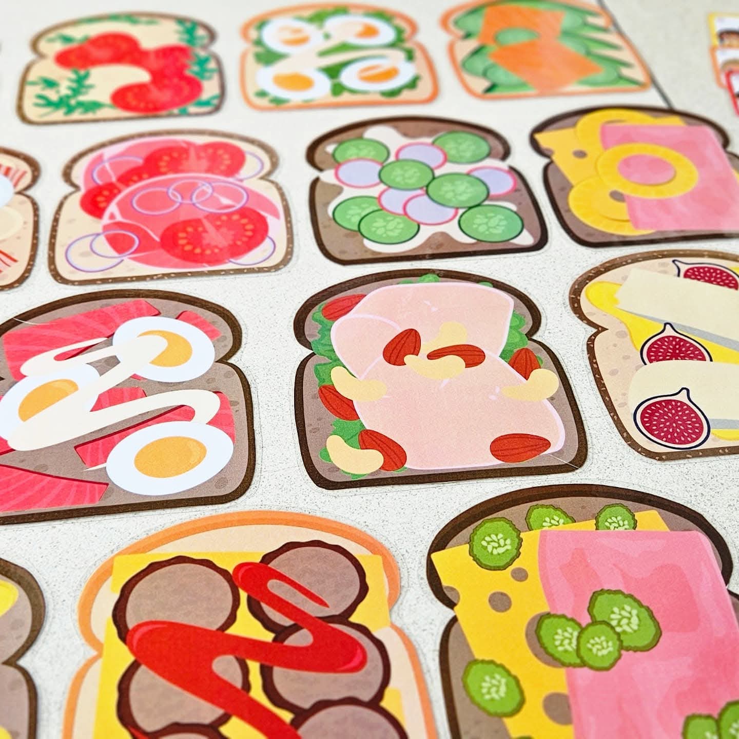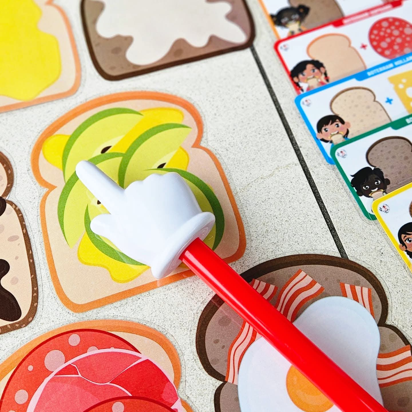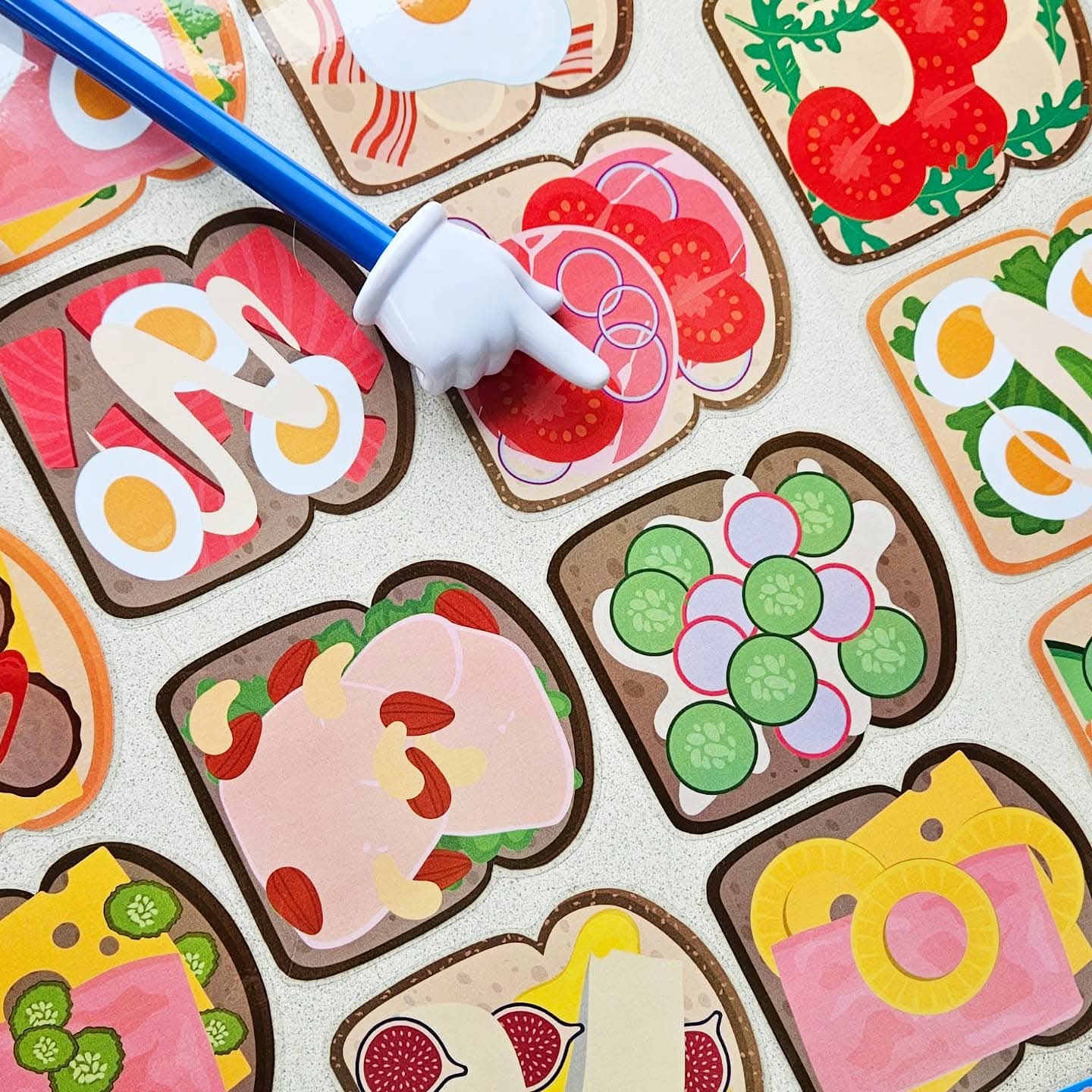 Ce jeu se joue de 2 à 4 joueurs. Tu peux proposer le jeu avec des combinaisons de 1, 2, 3 ou 4 ingrédients sur le sandwich (pain blanc, multicéréales ou complet). Choisis avec combien tu souhaites jouer. Par exemple : 1. sandwich avec pâte à tartiner au chocolat, 2. salade avec fromage, 3. bacon et mozzarella avec œuf, 4. fromage aux herbes, saumon et concombres avec roquette. Tous les sandwichs sont dispersés sur la table. Fais une pile avec les cartes combinaison et place-la face cachée sur la table. À chaque tour, quelqu’un (ou le maître/la maîtresse) retourne la carte combinaison du dessus. (Ou laisse-les piocher une carte dans un sac tactile ou une boîte à pain). Cherchez tous ensemble très vite le sandwich avec la bonne combinaison d’ingrédients. Tu vois le bon sandwich ? Sprint vite avec ta main et pose ta main sur le sandwich ! (Ou joue avec une baguette à doigt). Si ta main est la première sur le bon sandwich, tu peux garder ce sandwich et la carte combinaison correspondante. Continue ainsi jusqu’à ce que tous les sandwichs soient pris. Compte maintenant les sandwichs, qui en a ramassé le plus ? Qui a été le sprinteur de sandwichs le plus rapide ? C’est le gagnant de ce jeu. Tu es prêt pour la nouvelle année scolaire.