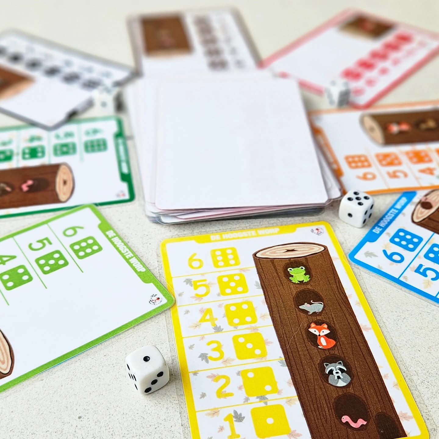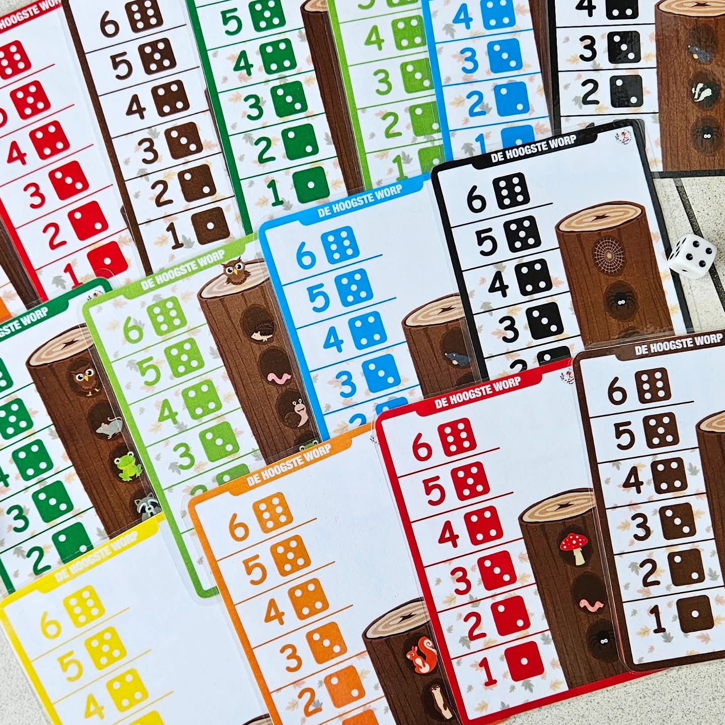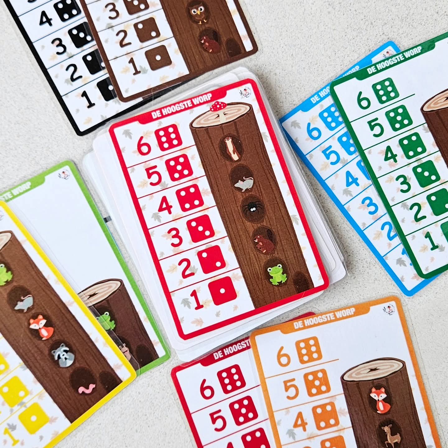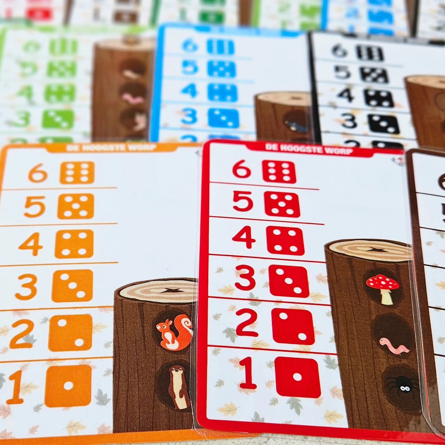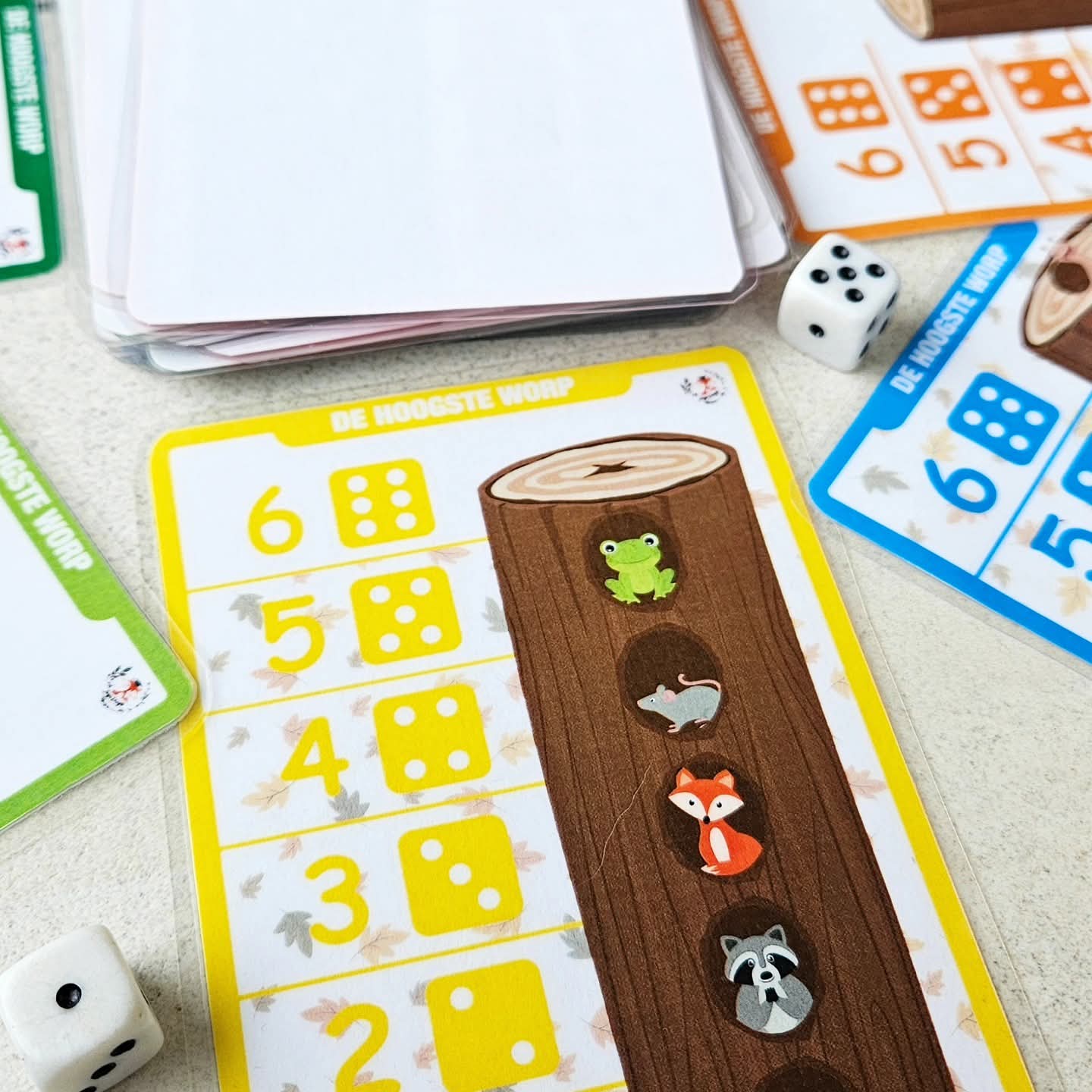 Versie 2: De hoogste worp met dobbelsteen. Speel per 4 tot 6, Schud de kaarten en maak 1 grote stapel omgekeerd op tafel. Elke speler krijgt een dobbelsteen. Draai elke ronde de bovenste kaart open van de stapel. Alle spelers dobbelen nu één keer tegelijk. Kijk en tel, wie heeft de hoogste worp? Wie heeft evenveel geworpen als het aantal bosbewoners in de boomstam? Diegene met dezelfde worp mag de kaart van de stapel bij zich houden. Heeft niemand dezelfde worp, dan gaat deze kaart terug onderaan de stapel. Hebben meerdere spelers dezelfde worp dan speel je apart nog eens een dobbel duel tussen deze spelers. Zo beslis je wie de kaart als punt mag innemen. De hoogste worp wint. Elke ronde draaien we een nieuwe kaart open. Ga door tot alle kaarten weg zijn van de stapel. Wie heeft de meeste punten verzameld?