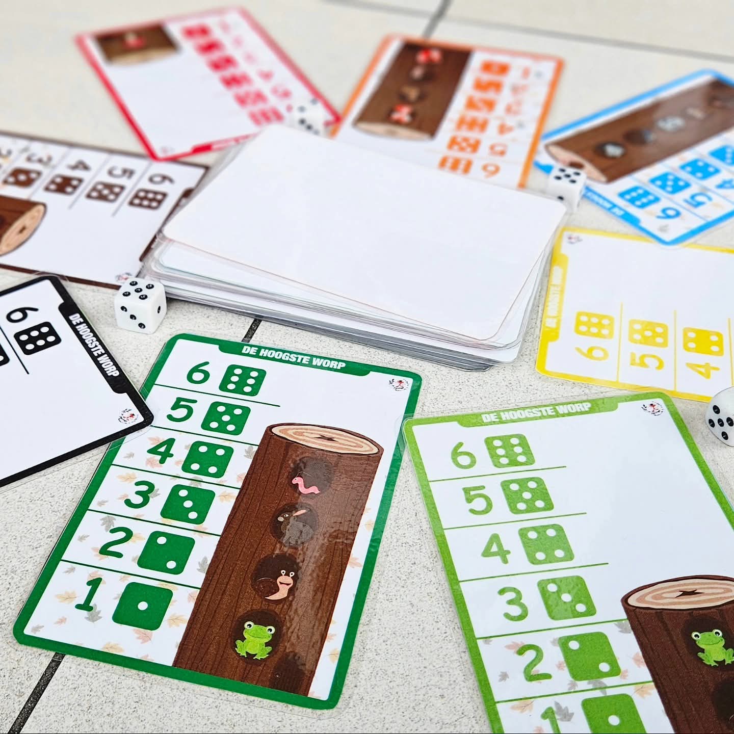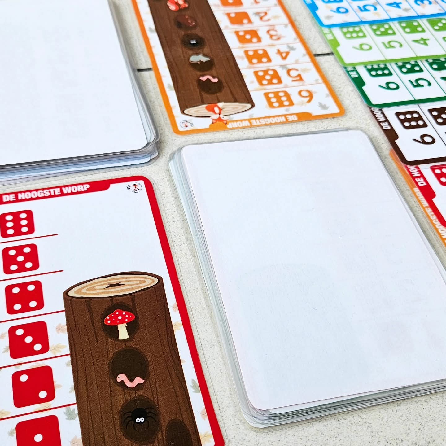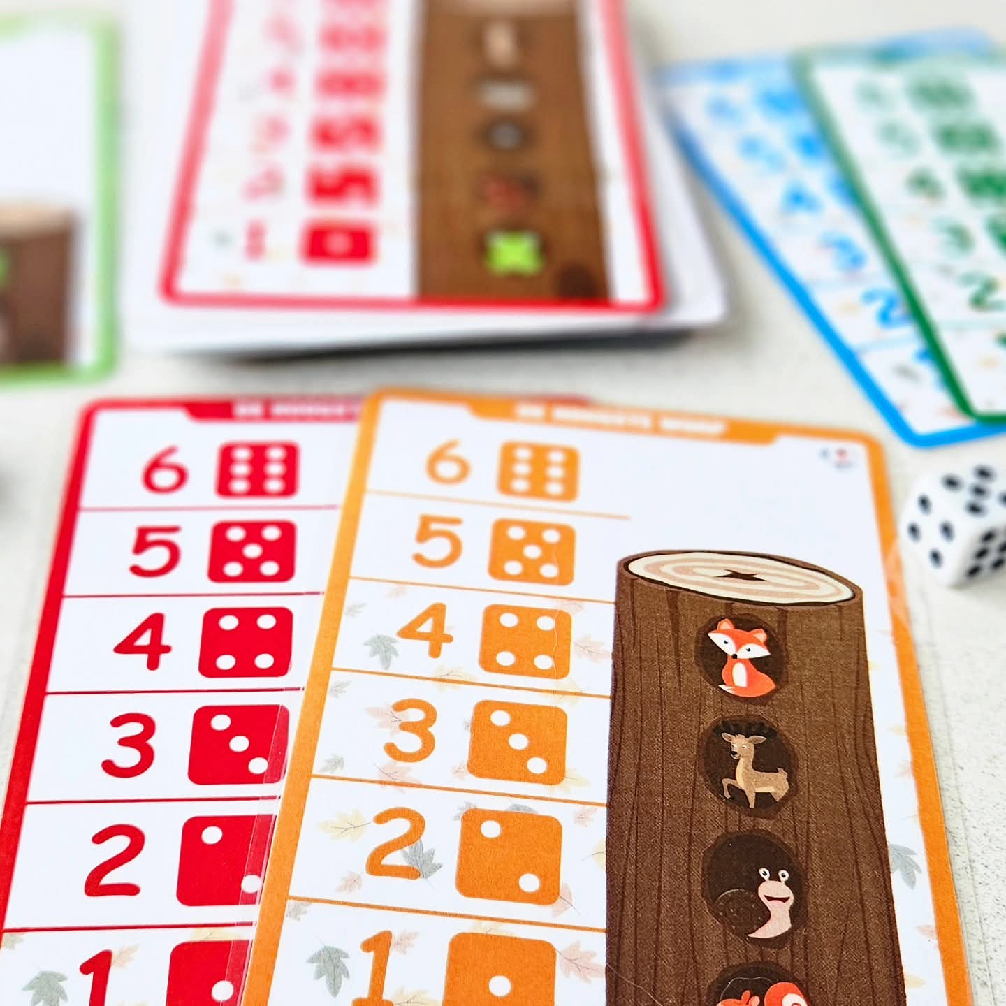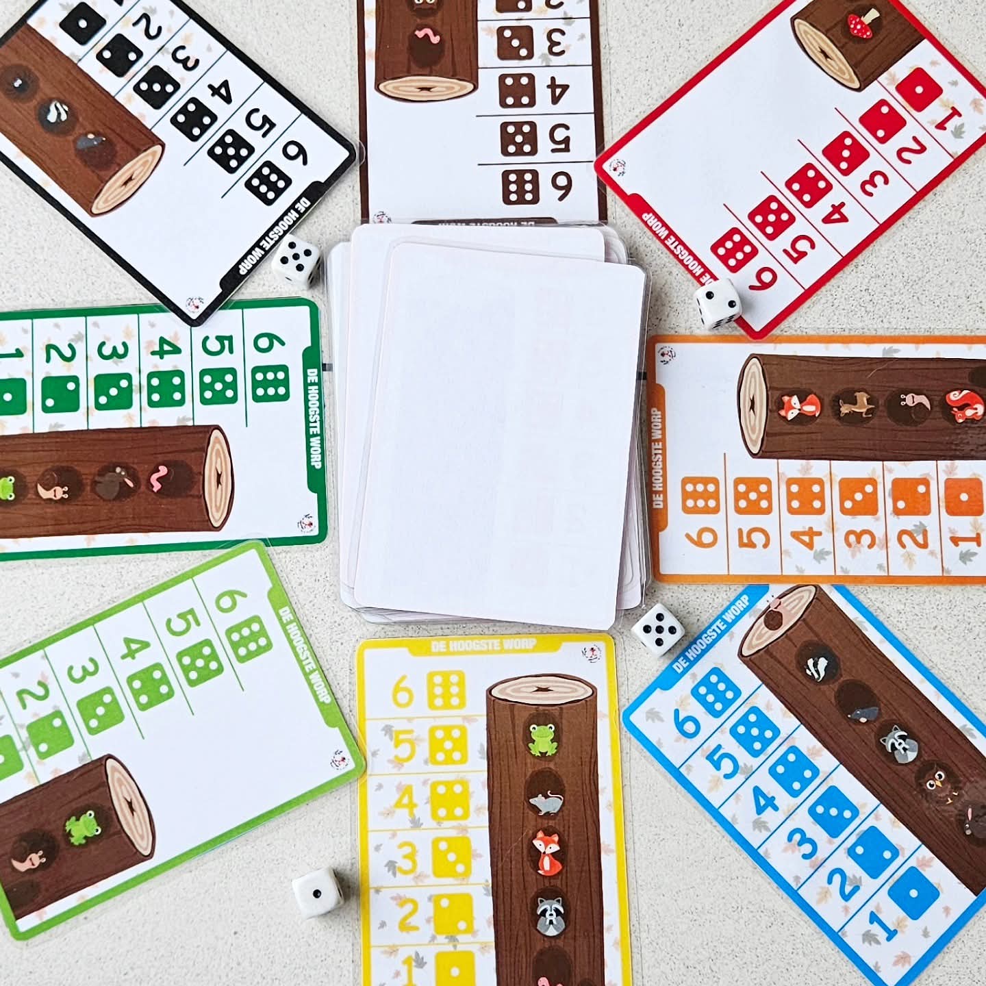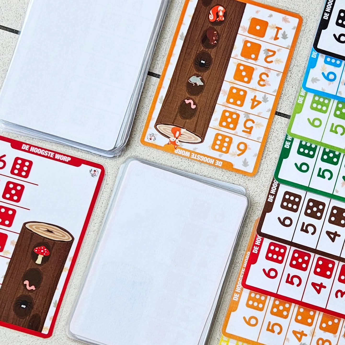 Versie 2: De hoogste worp met dobbelsteen. Speel per 4 tot 6, Schud de kaarten en maak 1 grote stapel omgekeerd op tafel. Elke speler krijgt een dobbelsteen. Draai elke ronde de bovenste kaart open van de stapel. Alle spelers dobbelen nu één keer tegelijk. Kijk en tel, wie heeft de hoogste worp? Wie heeft evenveel geworpen als het aantal bosbewoners in de boomstam? Diegene met dezelfde worp mag de kaart van de stapel bij zich houden. Heeft niemand dezelfde worp, dan gaat deze kaart terug onderaan de stapel. Hebben meerdere spelers dezelfde worp dan speel je apart nog eens een dobbel duel tussen deze spelers. Zo beslis je wie de kaart als punt mag innemen. De hoogste worp wint. Elke ronde draaien we een nieuwe kaart open. Ga door tot alle kaarten weg zijn van de stapel. Wie heeft de meeste punten verzameld?