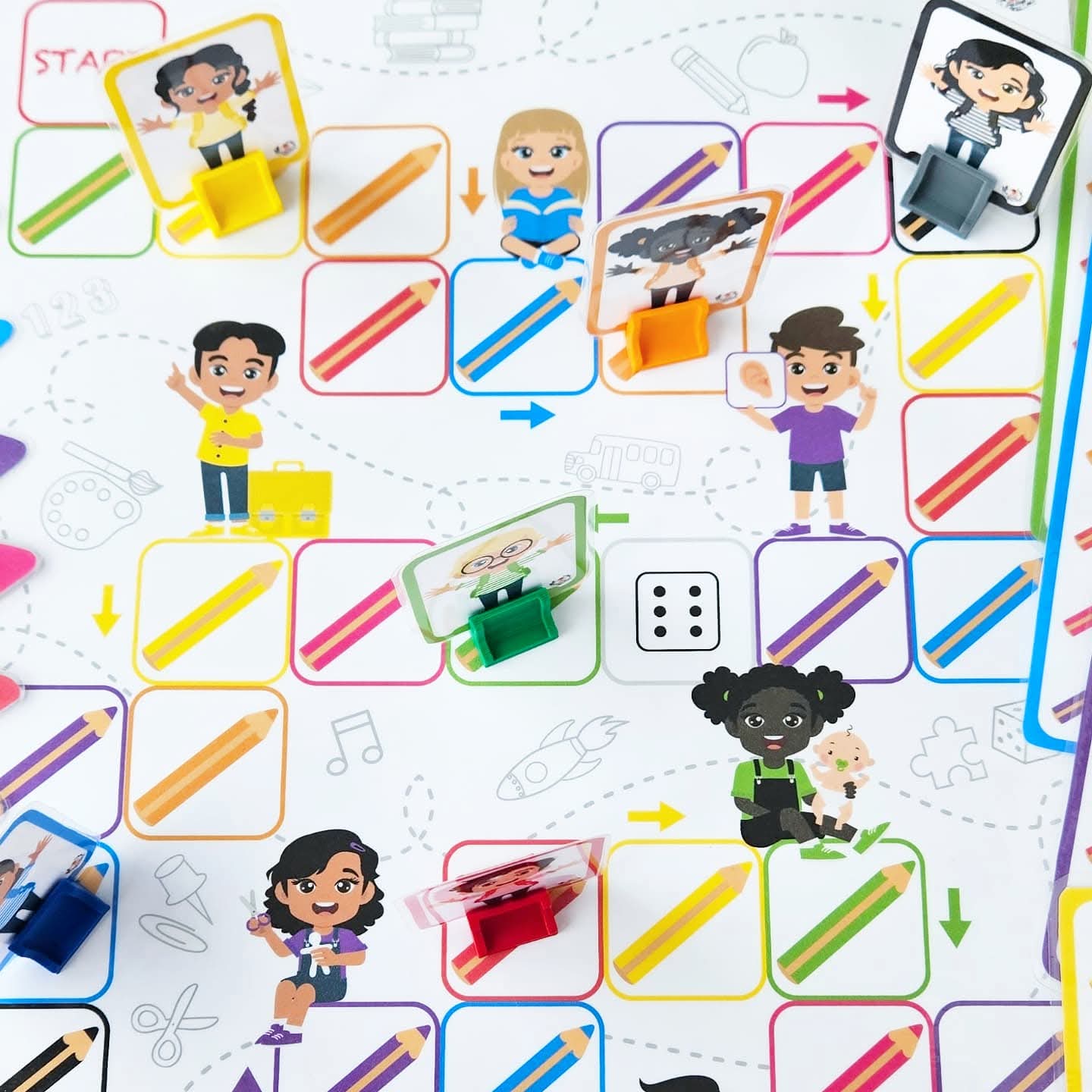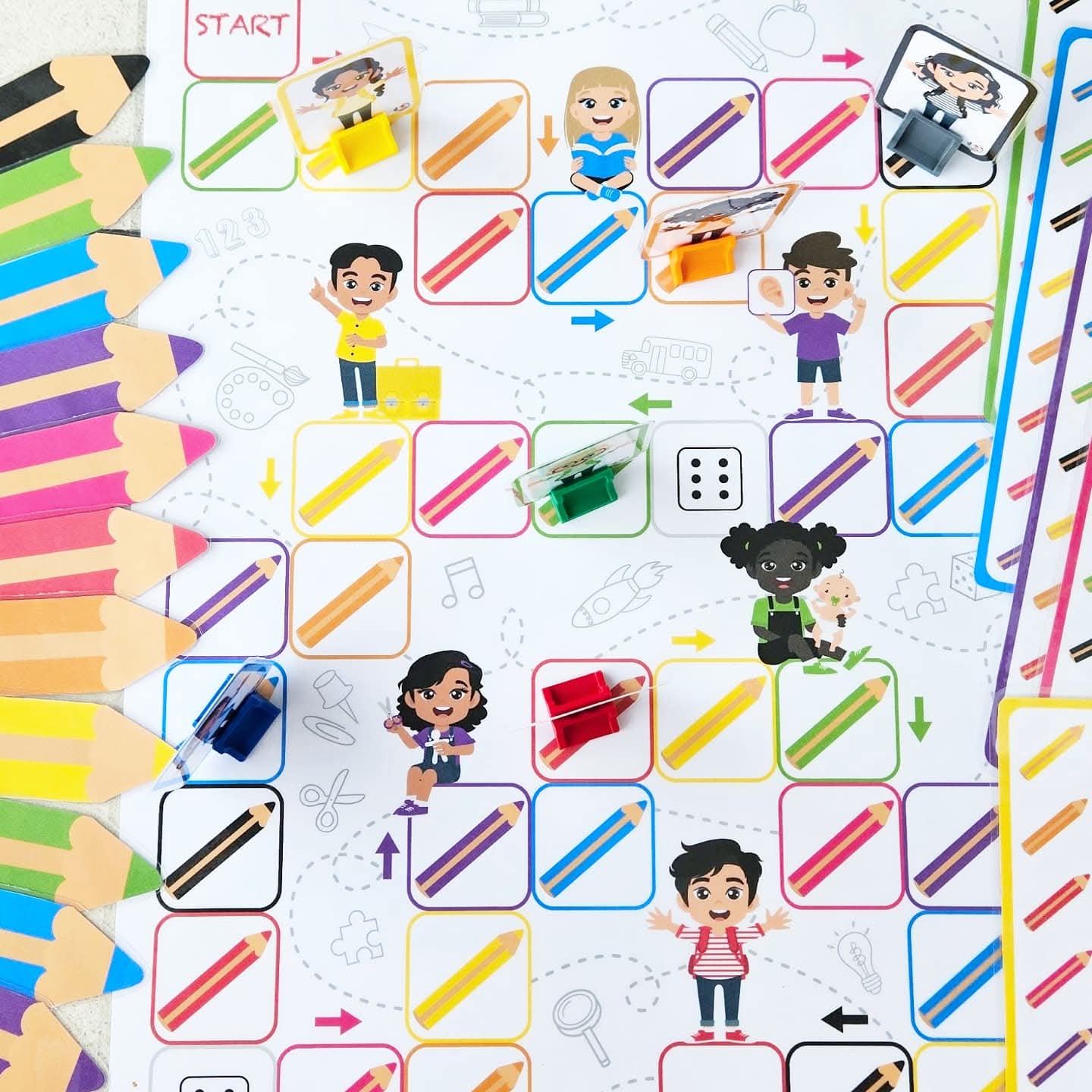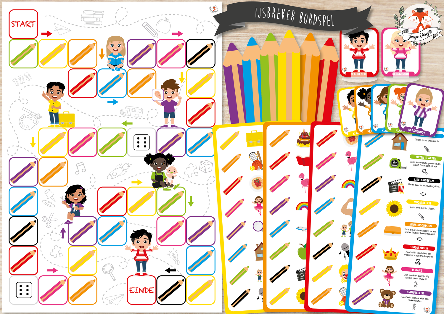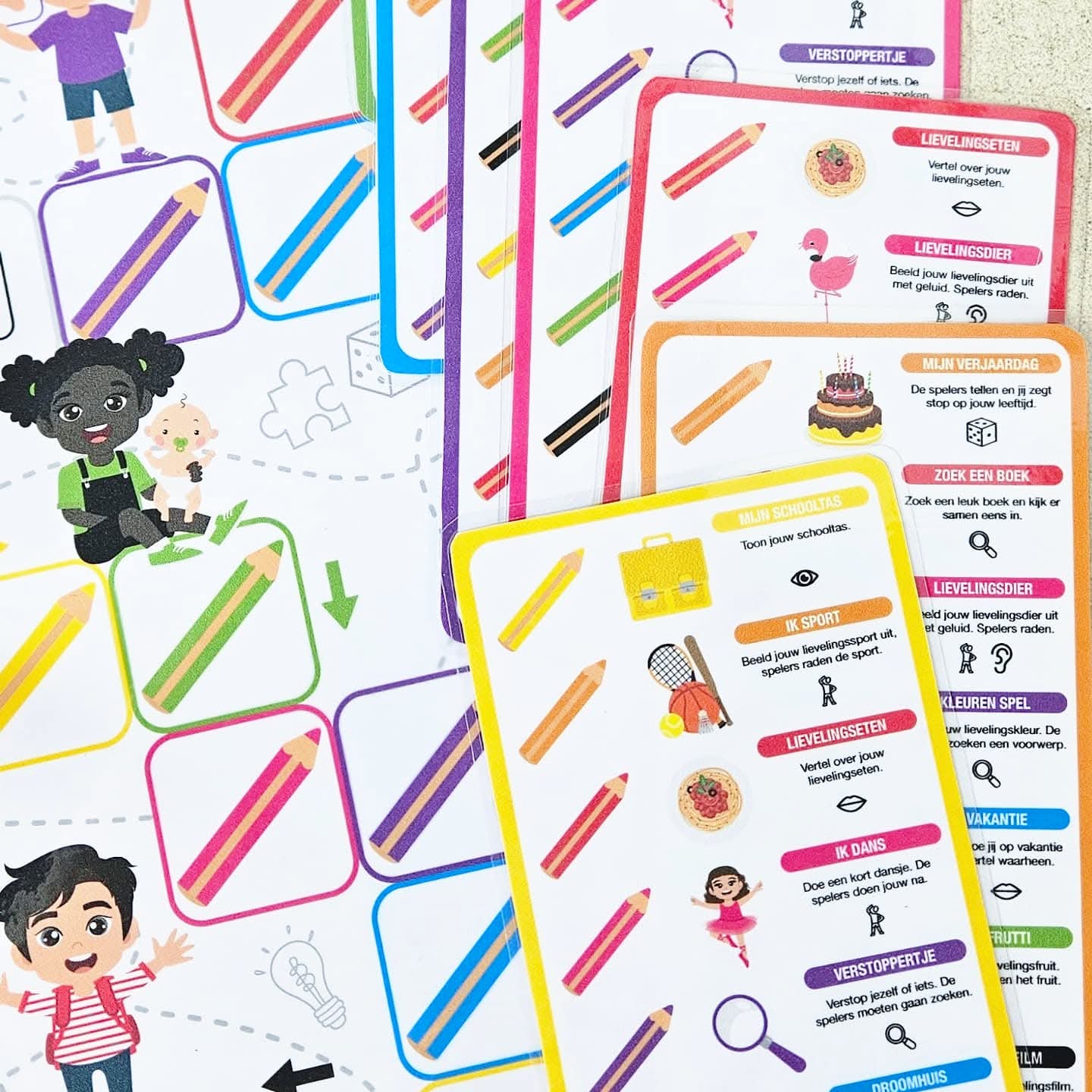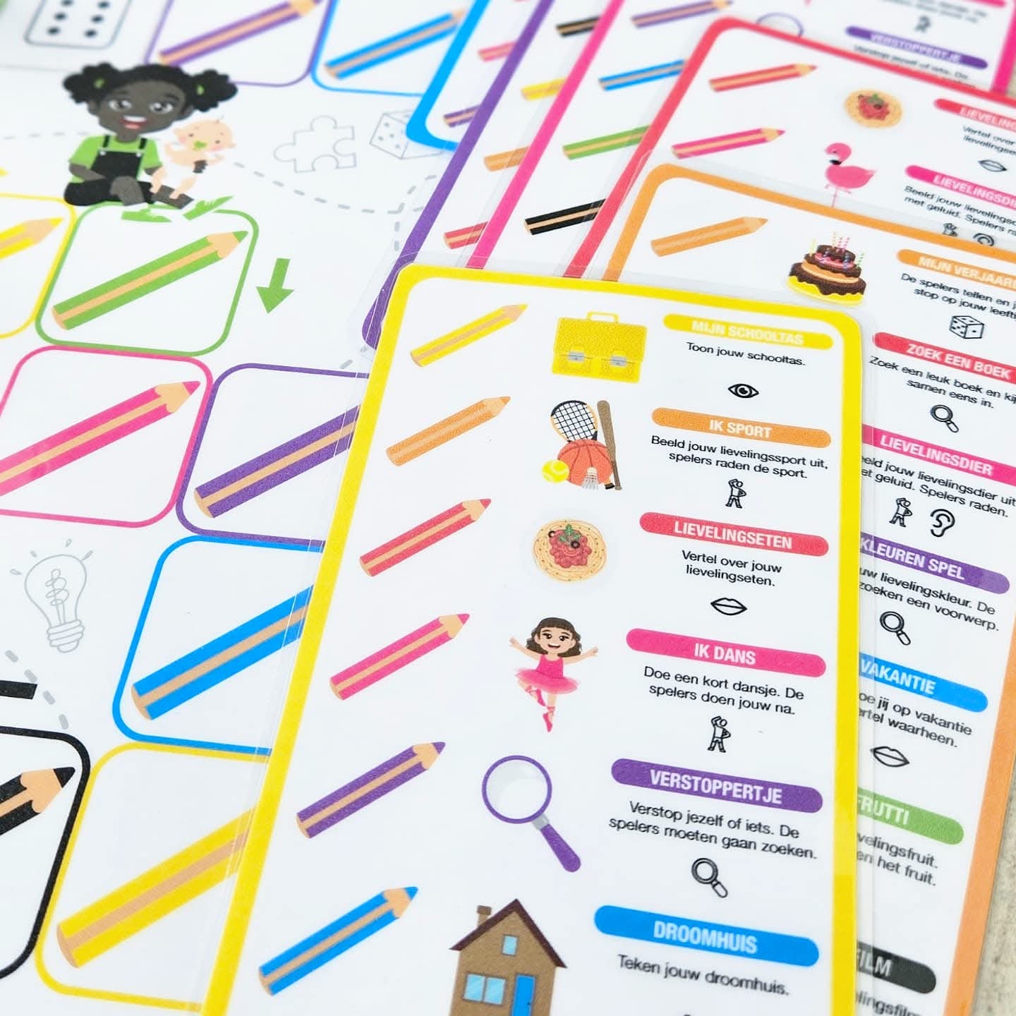 Je kan dit spel spelen zonder opdrachtkaart of met, als extra leuke uitdaging om jouw klasgenoten beter te leren kennen. Elk kleur potlood staat voor een kennismakende handeling bijv: vertellen, zoeken, luisteren, bewegen, knutselen, spelen, raden etc...