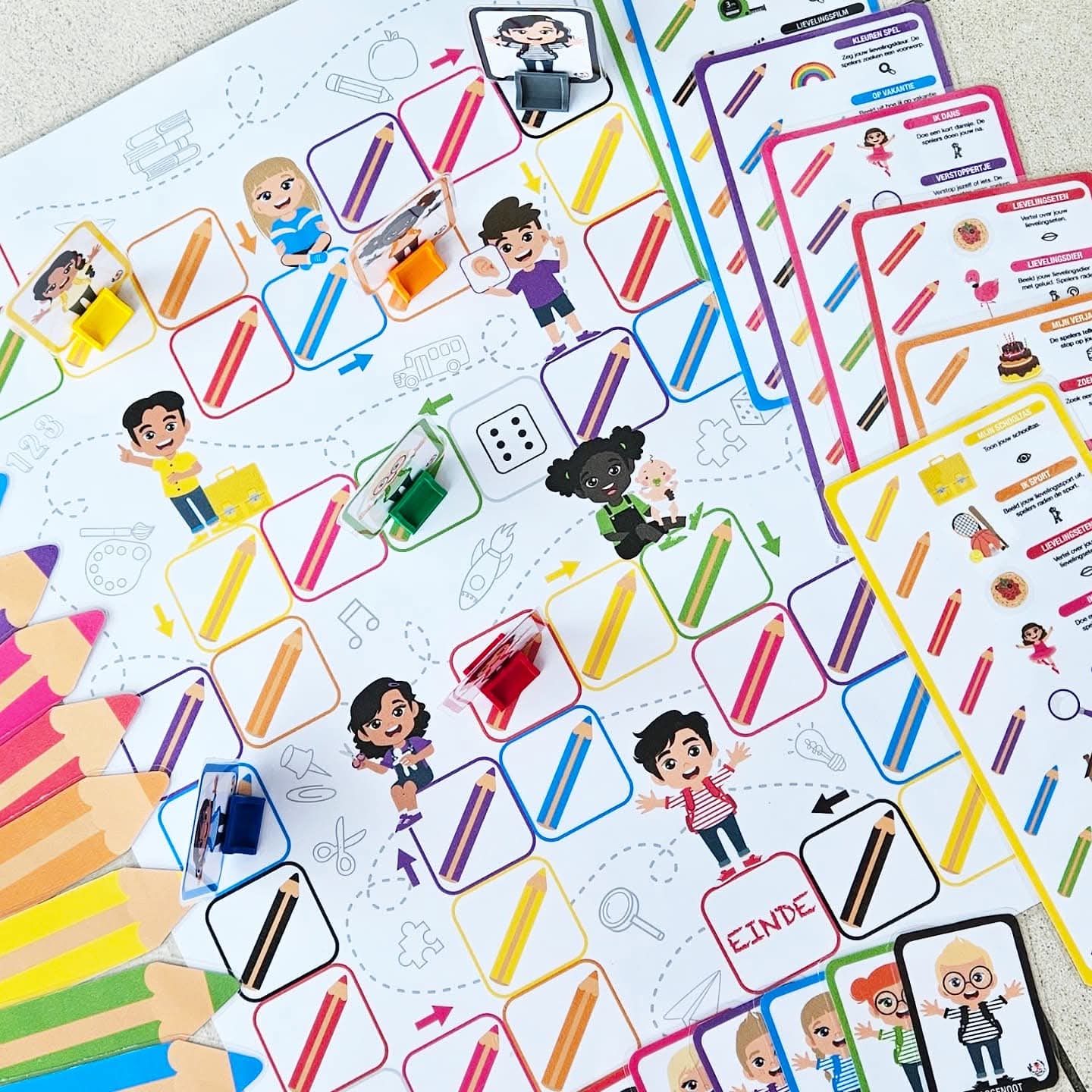 Dit spel kan met 2-8 gespeeld worden. Elke speler kiest een kleur klasgenoot kaartje als pion. Iedereen begint bij het vakje start op het spelbord. Dobbel elk om beurt en verplaats je klasgenootje van potlood naar potlood. Op welk kleur potlood stopt jouw klasgenootje? Neem van dat kleur een potlood en verzamel in een bakje apart. Kom je op de dobbelsteen in het witte vakje, mag je nog eens dobbelen. Wie bereikt als snelste het einde? En wie is de klasgenoot die de meeste potloden heeft verzameld?