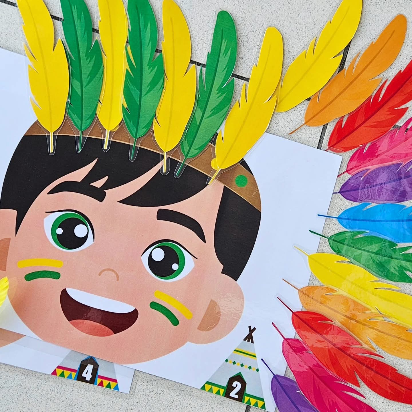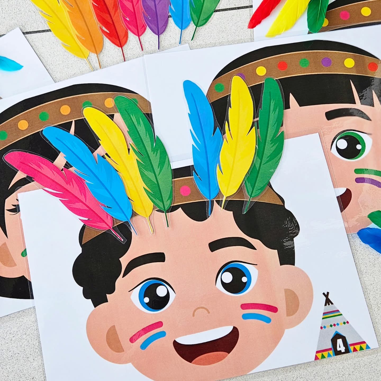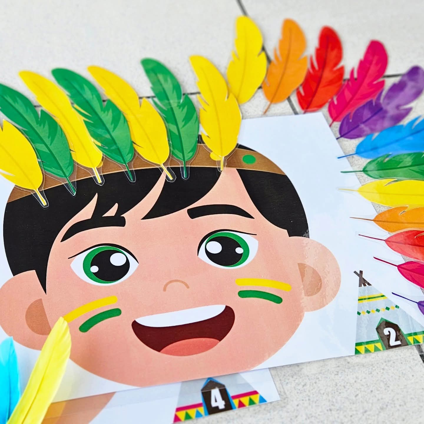 Dit spel kan met 2-4 gespeeld worden. Kies vooraf met welk aantal kleurtjes in patroon je gaat spelen. Elke speler kiest een meisje of jongen met dat aantal kleuren in patroon reeks (2,3 of 4). Het aantal staat aagegeven op de tipi’s. Grabbel elk om beurt een veertje uit de voelzak of voeldoos. Welk kleurtje veer is het? Heb jij deze nodig om jouw indianentooi te maken? Kijk naar de kleur bolletjes op jouw hoofdband. Zo ja, mag je deze op het bolletje plaatsen. Heb je meer dan 1 van dit kleur nodig, moet je sparen. Je mag maar 1 veer per beurt plaatsen. Heb je dit kleur niet nodig, dan gaat jouw beurt voorbij. Probeer als eerste jouw indianentooi volledig te vullen met de juiste kleuren in patroon. Dan ben jij de chief van de stam, Uch!!