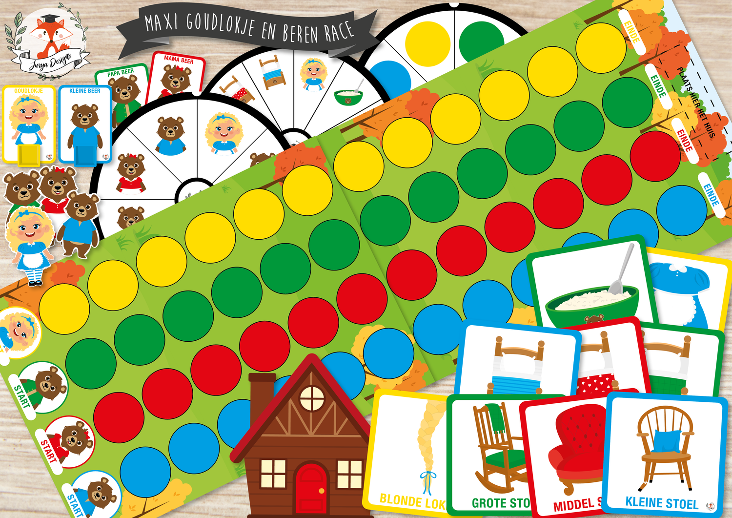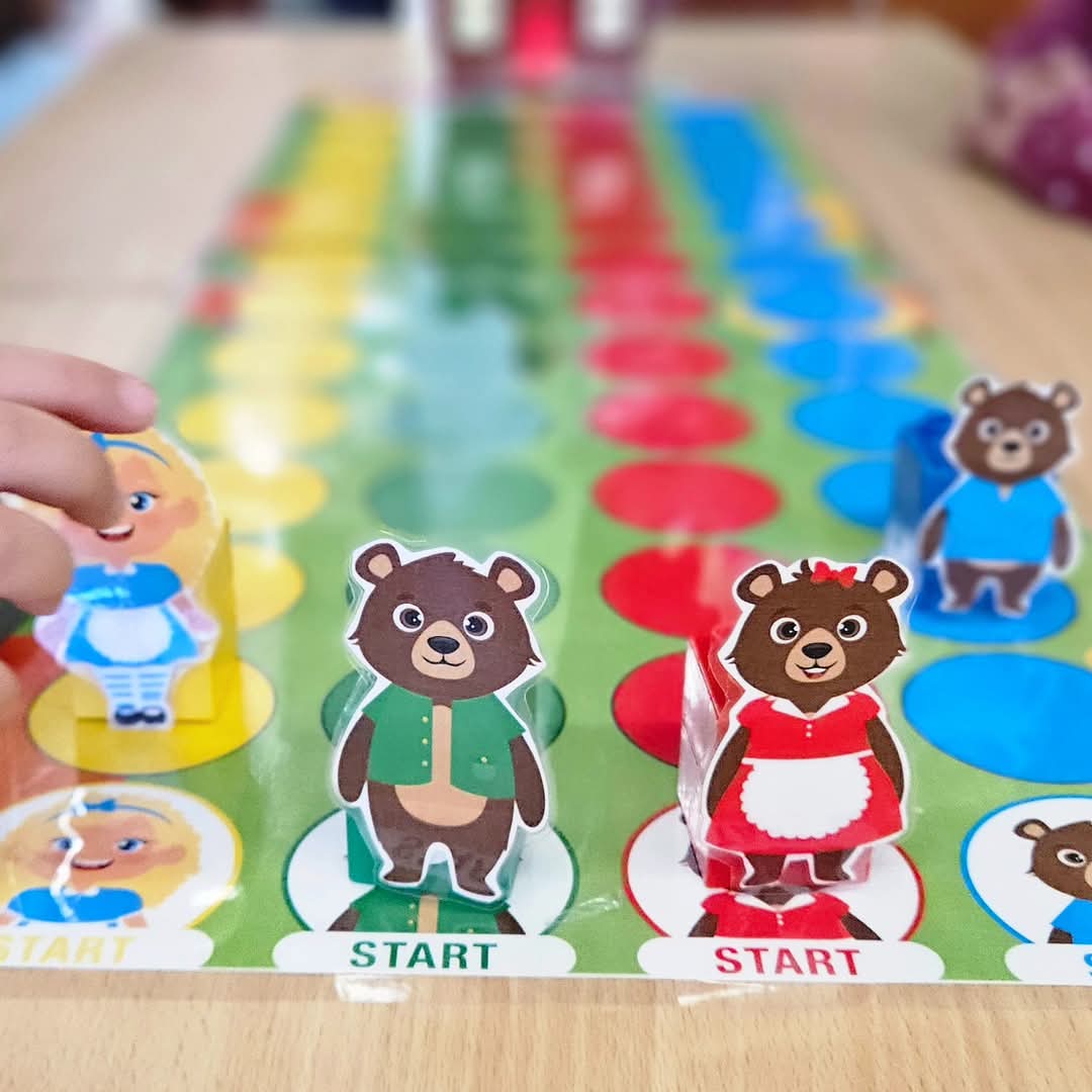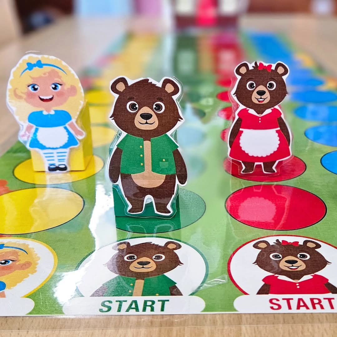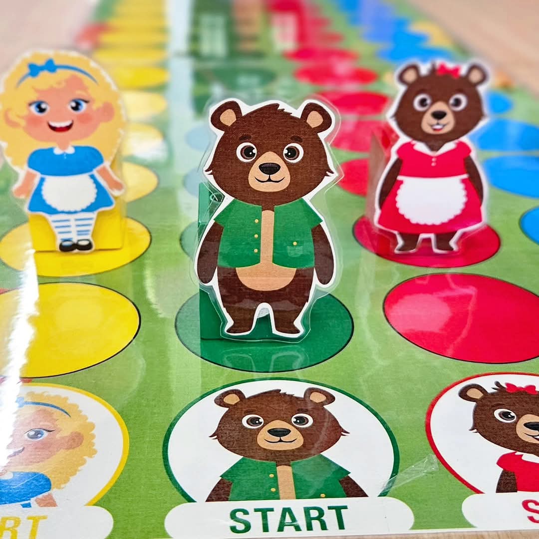 Voor het spel kan beginnen, bevestig je de 2 delen van het spelbord aan elkaar. Knip en plooi het extra stuk om bij het huis en plaats het huisje op het spelbord. Schud de kaartjes en maak een stapel. Dit spel kan met 4 gespeeld worden. Elke speler kiest een pion (bijv: Goudlokje, papa beer, mama beer of kleine beer). U kan de pion kaartjes gebruiken of knip de figuren uit. Alle pionnen staan op de afbeelding van hun personage om te starten. Je kan deze race op 4 diverse manieren aanbieden om te differentiëren.