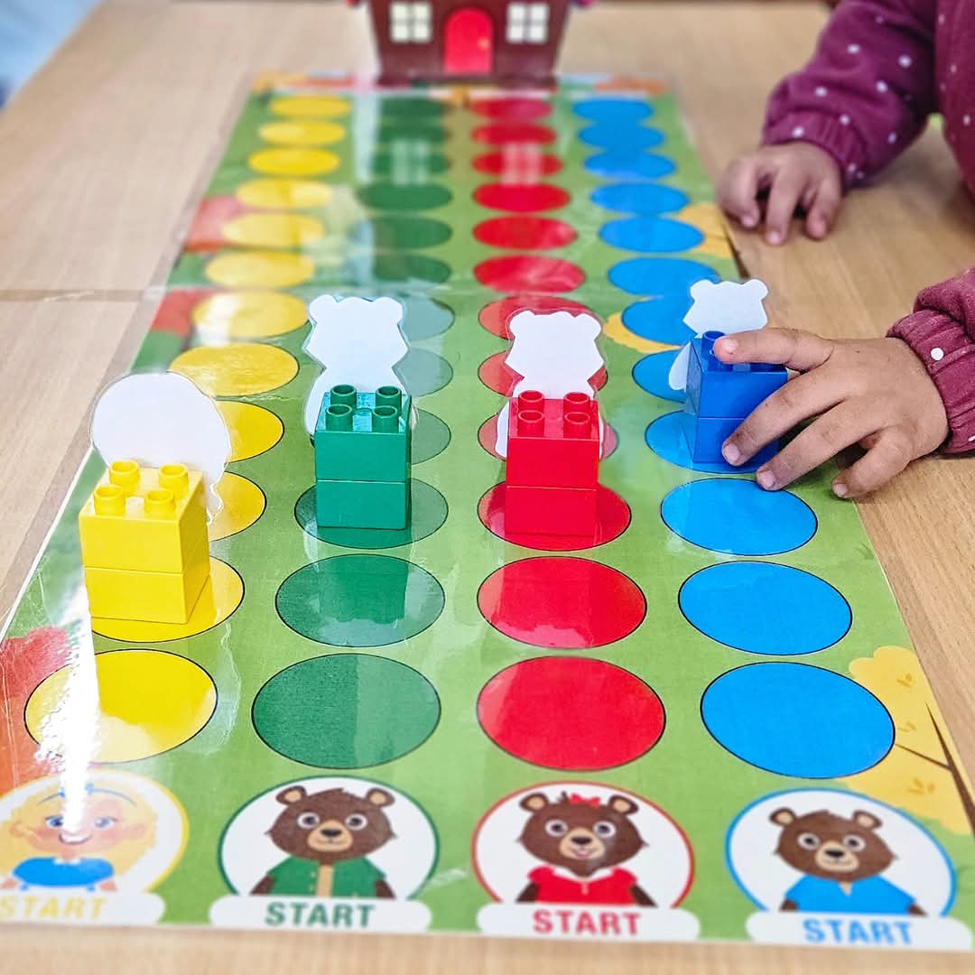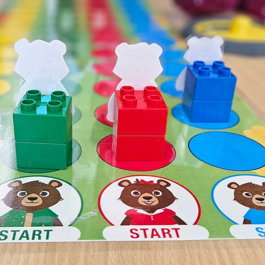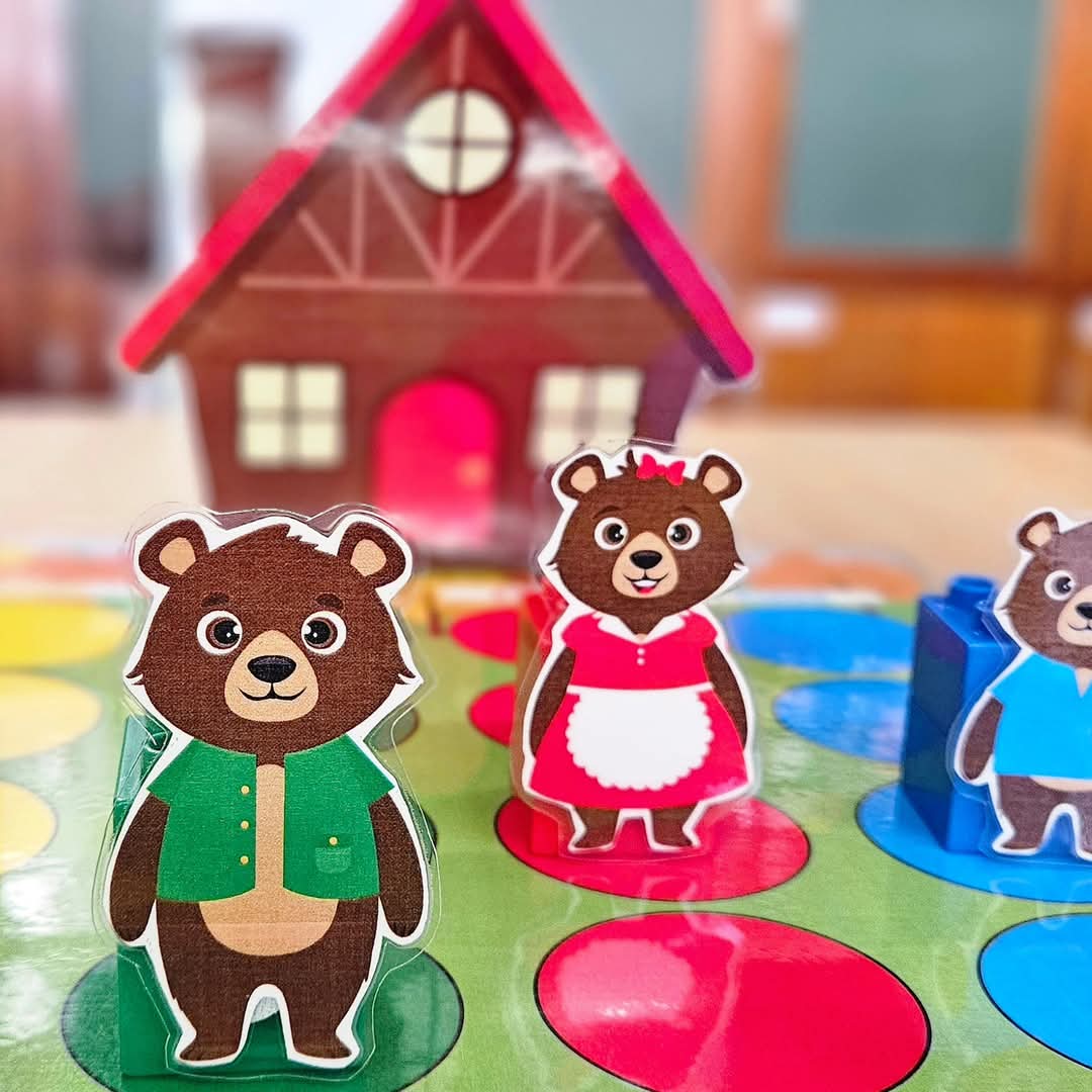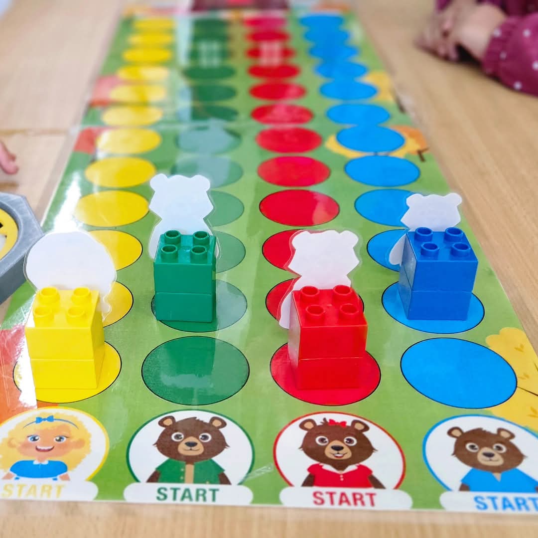 Voor het spel kan beginnen, bevestig je de 2 delen van het spelbord aan elkaar. Knip en plooi het extra stuk om bij het huis en plaats het huisje op het spelbord. Schud de kaartjes en maak een stapel. Dit spel kan met 4 gespeeld worden. Elke speler kiest een pion (bijv: Goudlokje, papa beer, mama beer of kleine beer). U kan de pion kaartjes gebruiken of knip de figuren uit. Alle pionnen staan op de afbeelding van hun personage om te starten. Je kan deze race op 4 diverse manieren aanbieden om te differentiëren.