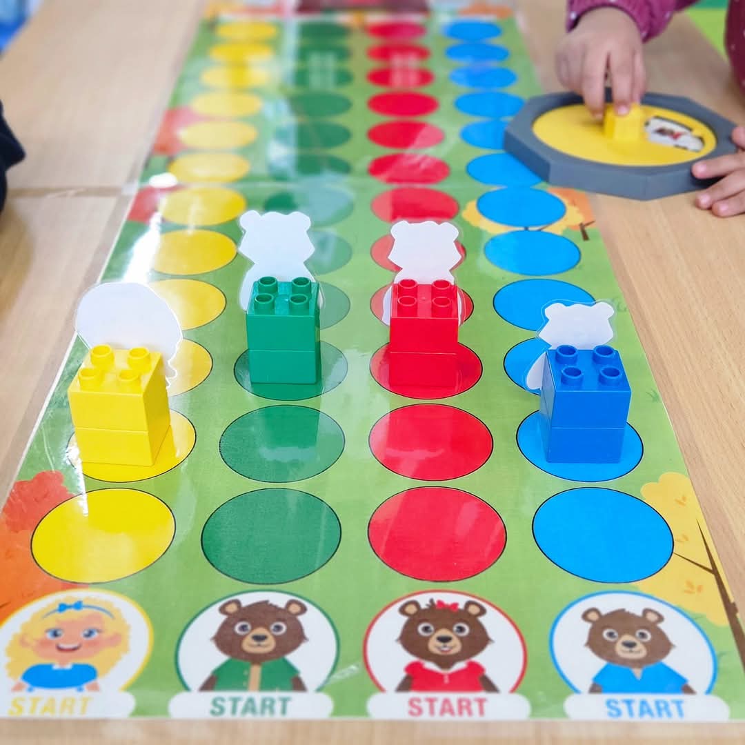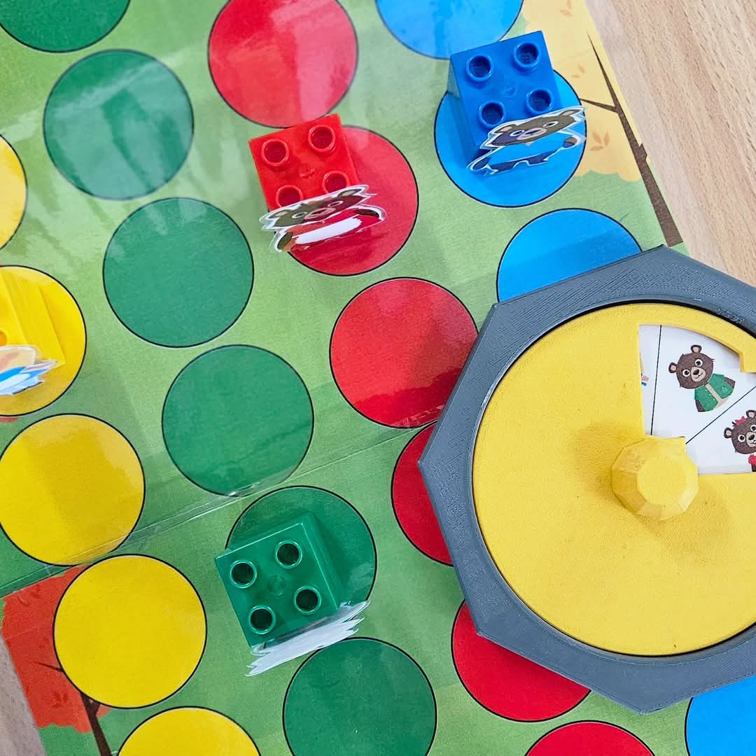 Spelvorm 2, Spin het kleur: Elke beurt mag één speler met de C-spinner draaien. Welke kleur zien we? Enkel de speler met het personage die past bij dat kleur mag een stap vooruit. Bijv: Geel = Goudlokje, Groen = papa beer etc..