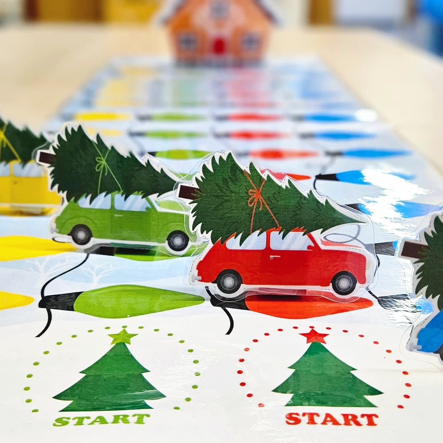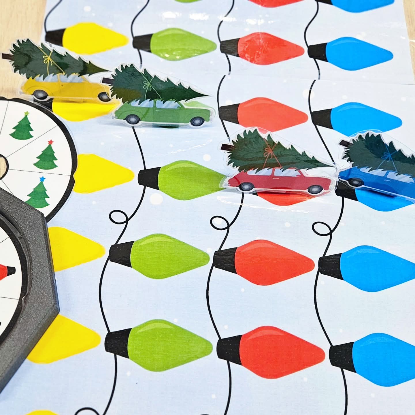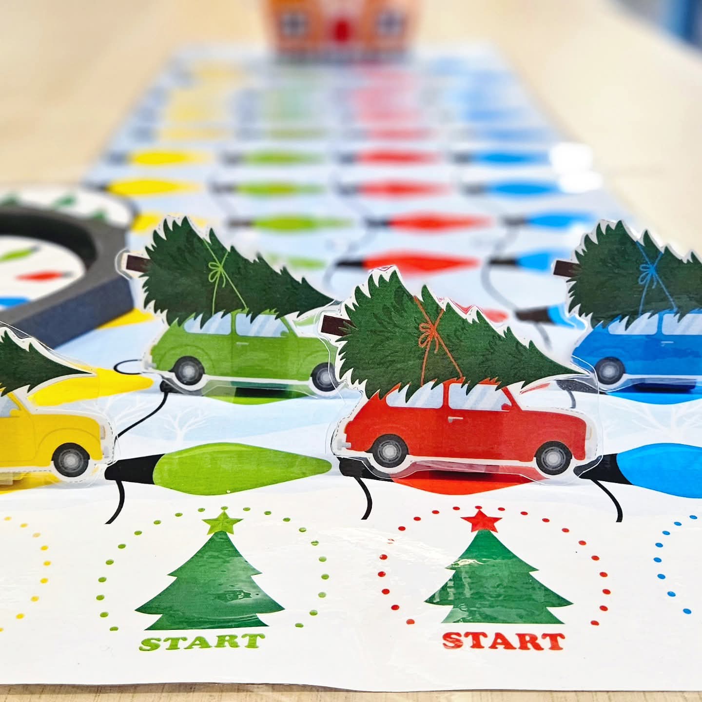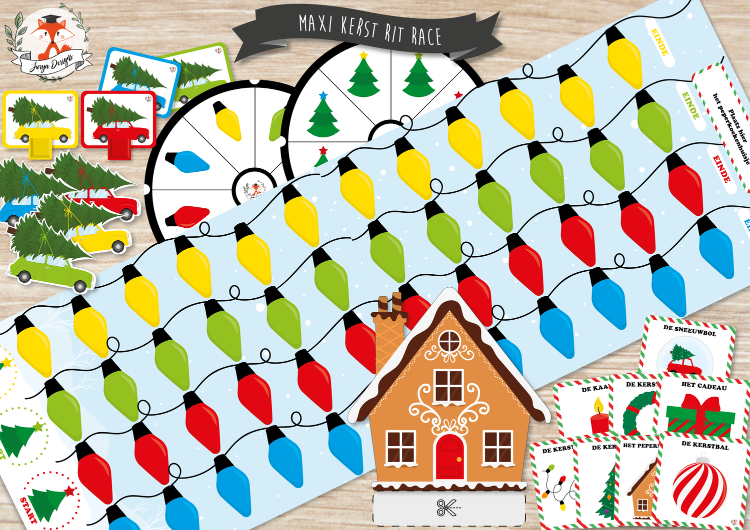 Voor het spel kan beginnen, bevestig je de 2 delen van het spelbord aan elkaar. Knip en plooi het extra stuk om bij het peperkoeken huis en plaats het huis op het spelbord. Schud de kerst kaarten en maak een omgekeerde stapel. Dit spel kan met 4 gespeeld worden. Elke speler kiest een pion (kleur auto met kerstboom). U kan de pion kaartjes gebruiken of knip de auto figuren uit. Alle pionnen staan op de afbeelding van hun passende kleur kerstboom om te starten op het spelbord. Je kan deze race op 3 diverse manieren aanbieden om te differentiëren.