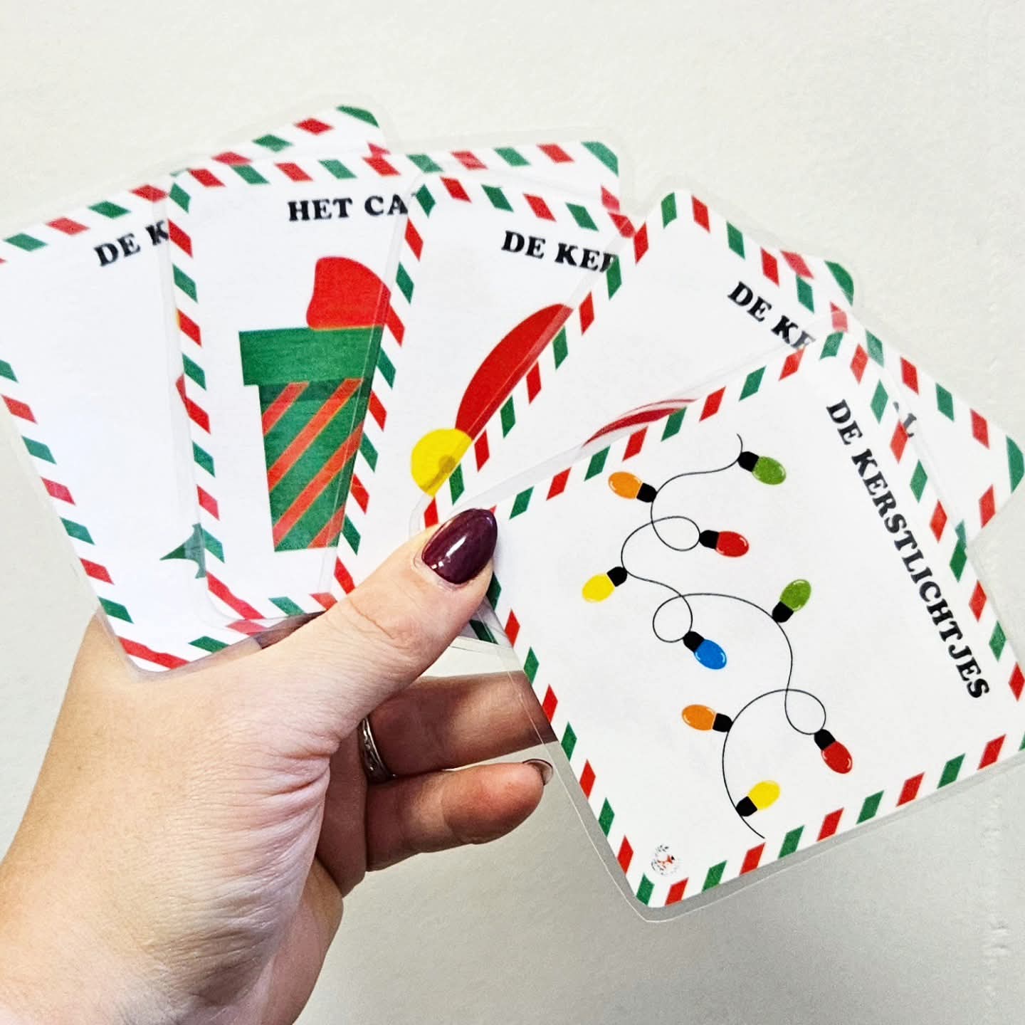 Spelvorm 1, Woordstukjes: Elke speler trekt om beurt één kaartje van de stapel en leg deze open. Welk kerst voorwerp staat erop? Klap en deel dit woord op in woordstukjes / lettergrepen. Hoeveel stukken hoor je in het woord (zonder lidwoord)? Je mag met jouw pion evenveel vakjes vooruit stappen op het spelbord. Ga door tot iemand als eerste het einde bereikt heeft.