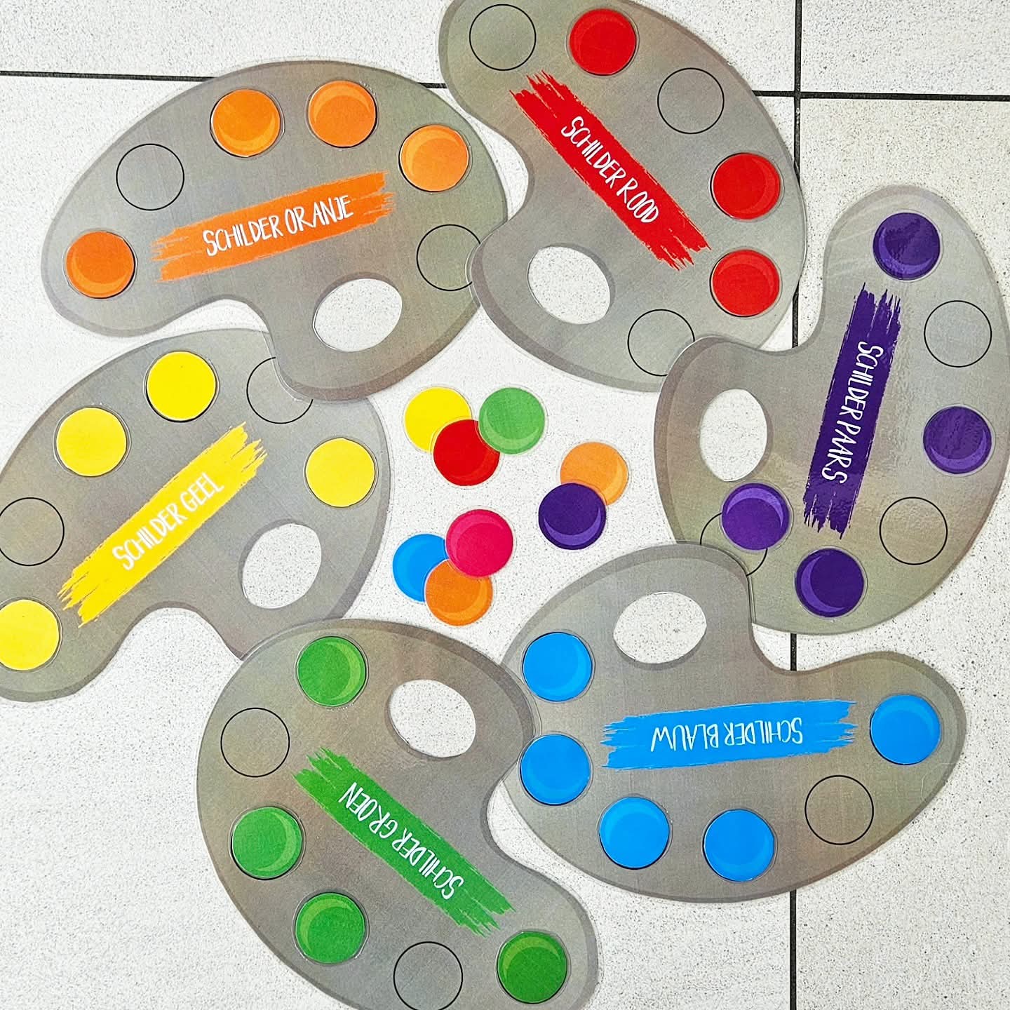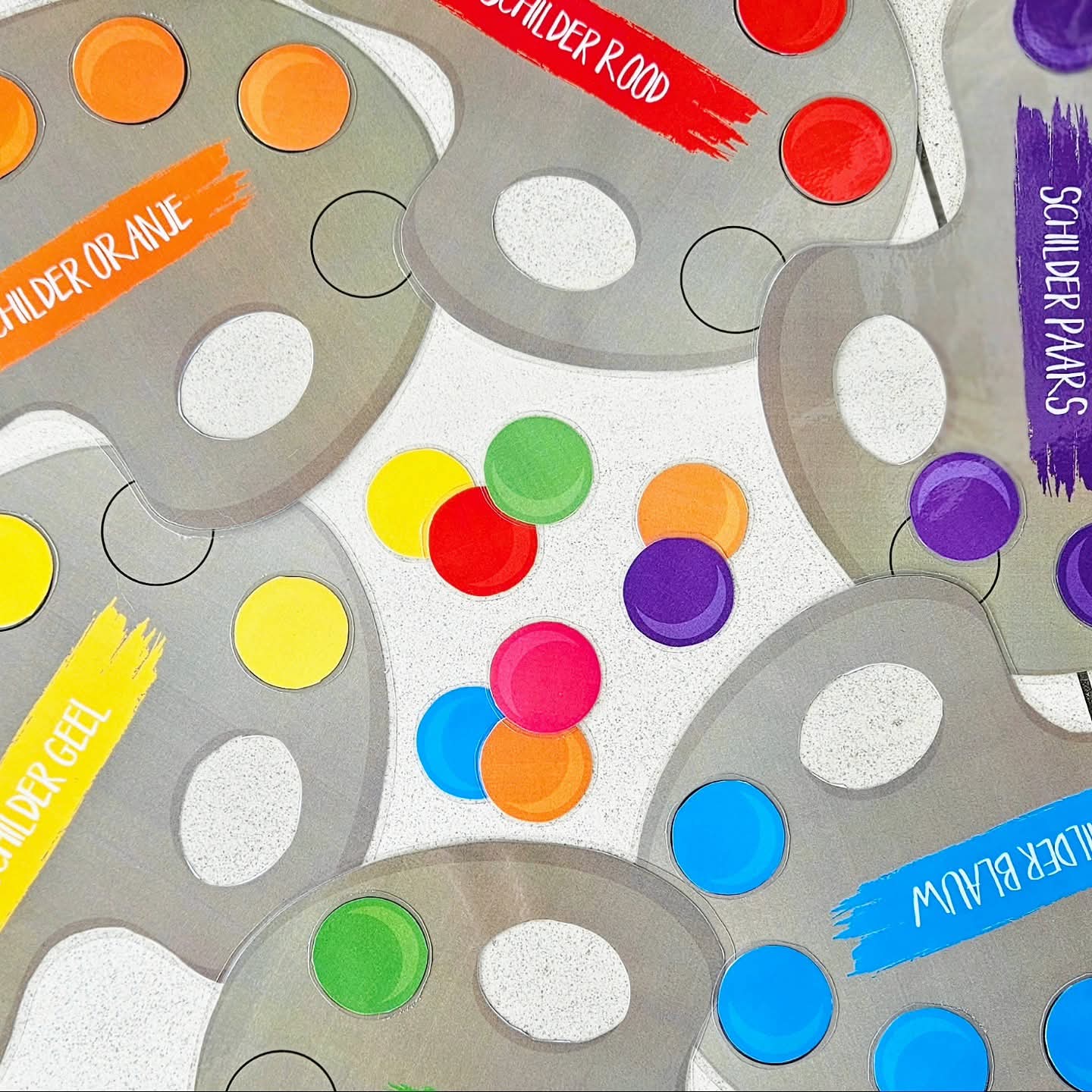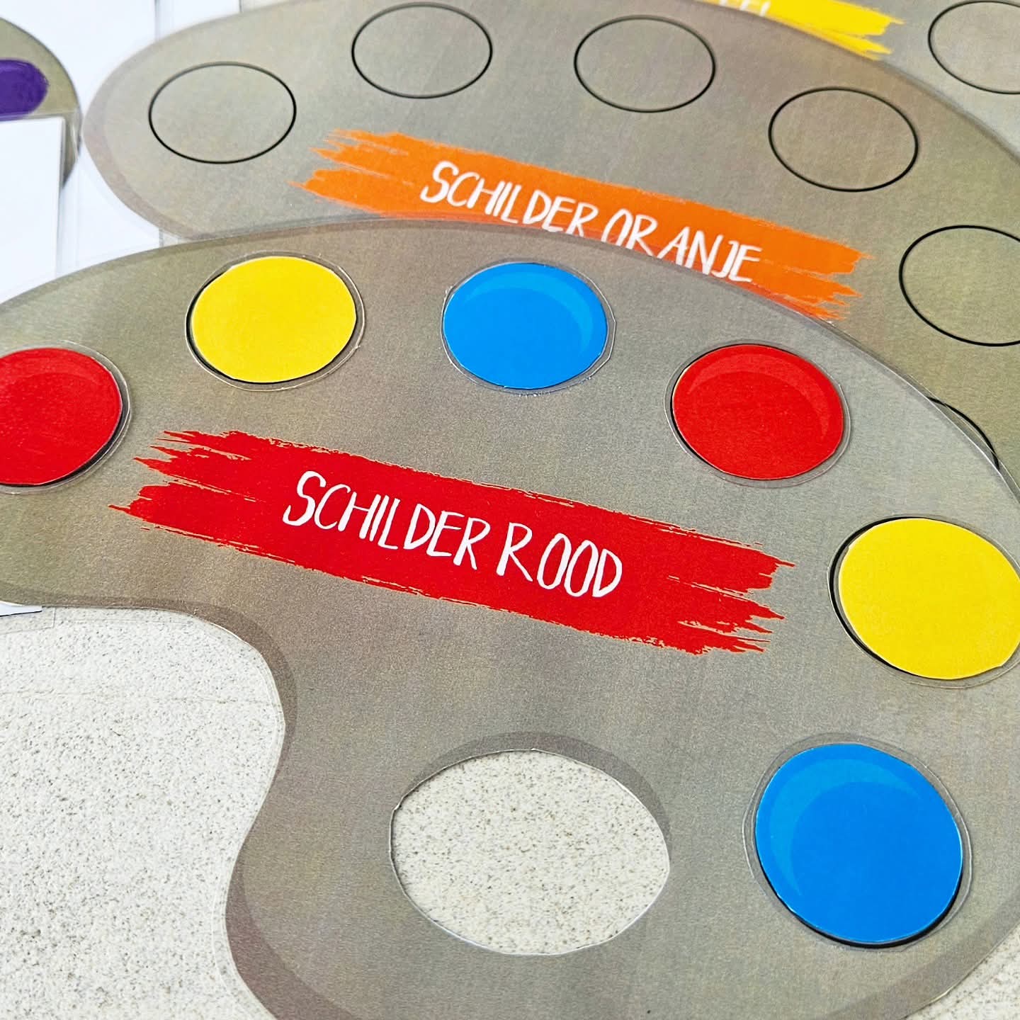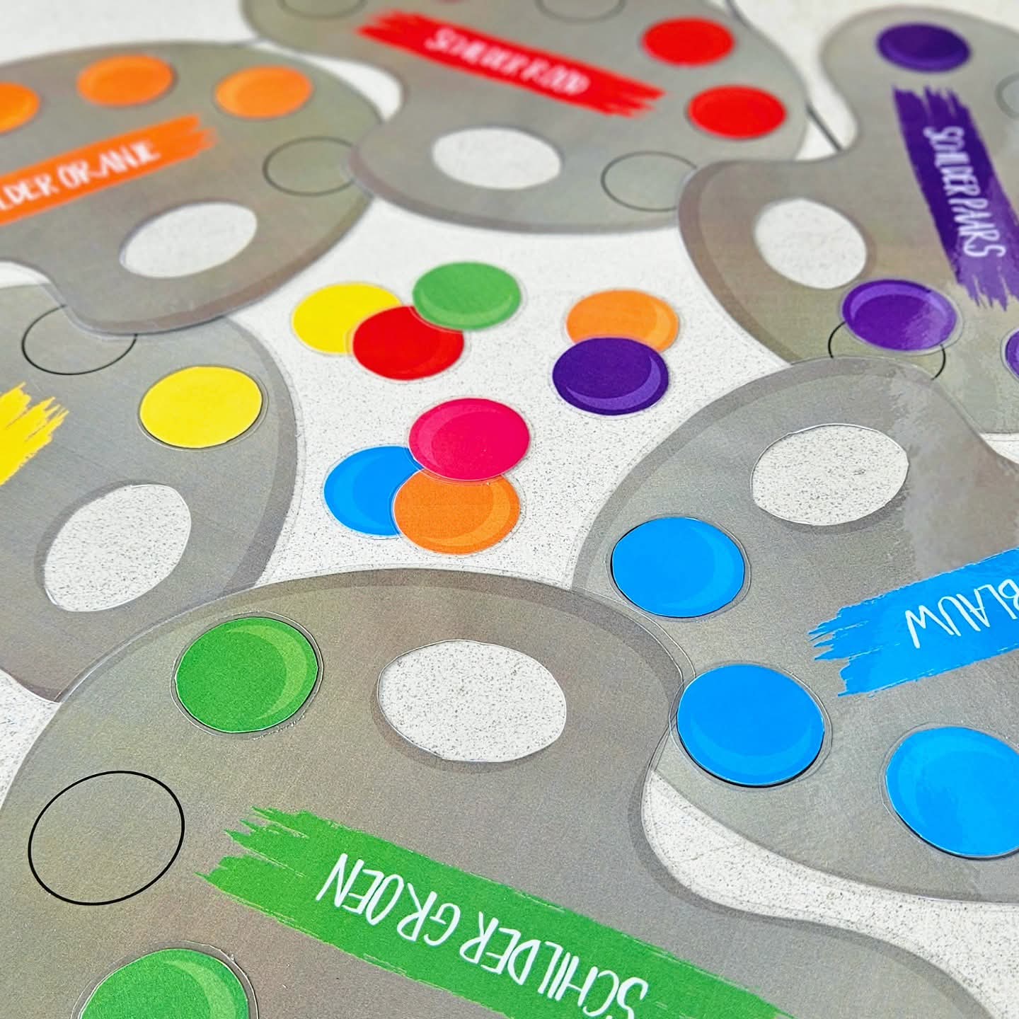 Dit spel kan met 2-8 gespeeld worden. Elke speler kiest een leeg schilderspalet en een palet kleurenkaart. Dit kleurpatroontje ga jij moeten verzamelen op jouw palet. Draai aan het rad en neem het juiste kleur, heb jij dat kleur nodig op jouw palet? Zo ja mag je deze op de juiste plaats op je palet plaatsen. Zo nee of je hebt het kleurtje al dan gaat je beurt voorbij. Kom je op de penselen, mag jij een kleurtje kiezen! Pro- beer als eerste jouw kleurkaart volledig te krijgen op je palet, dan ben jij de beste schilder van het land! Spetterde Spat wat een kunstenaar is dat!!