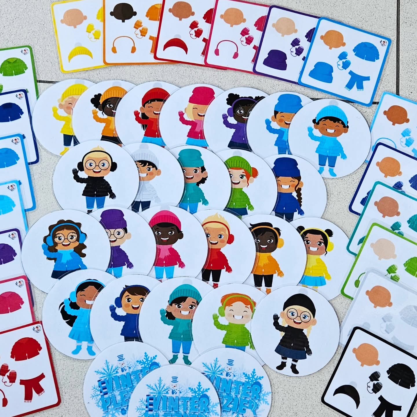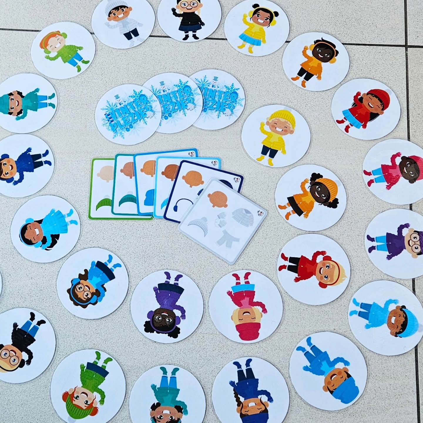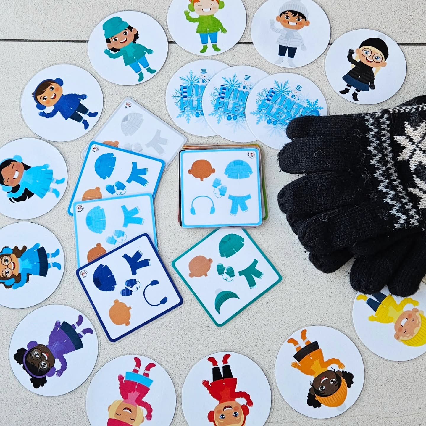 Dit spel kan met 2-4 gespeeld worden. Voor het spel begint schud je de ronde winter kids kaarten goed door elkaar. Plaats ze in een grote cirkel op tafel, met het prentje van de titel naar boven. Maak een omgekeerde stapel van de combinatie kaarten en plaats deze stapel middenin de cirkel + één paar wanten of handschoentjes. De eerste speler mag de bovenste kaart van de stapel openleggen. Elke speler mag tijdens deze ronde elk om beurt 1 kaart uit de cirkel omdraaien. Kijk allemaal naar het winter kindje en de kenmerken: soort winters hooddeksel, huidskleur, kleur winterjas en wanten. Past dit kindje bij het combinatiekaartje die open ligt? Zo ja, snel grijp de wanten! Ben jij de snelste die de wanten heeft gepakt, dan mag jij het combinatiekaartje bijhouden (goed voor 1 punt). Plaats de wanten terug! Het gevonden winter kindje blijft open liggen in de cirkel. Past het kindje niet bij de kaart, dan gaat je beurt voorbij. Draai het kaartje terug om. De combinatiekaart op de stapel blijft open liggen tijdens deze ronde. Wordt het juiste winter kindje niet gevonden, dan gaat de combinatiekaart terug onderaan de stapel. Ga zo door tot je alle winter kindjes hebt gevonden. De speler die de meeste kaarten heeft verzameld en dus de meeste punten is de winnaar! Klaar voor de winter bibbers.