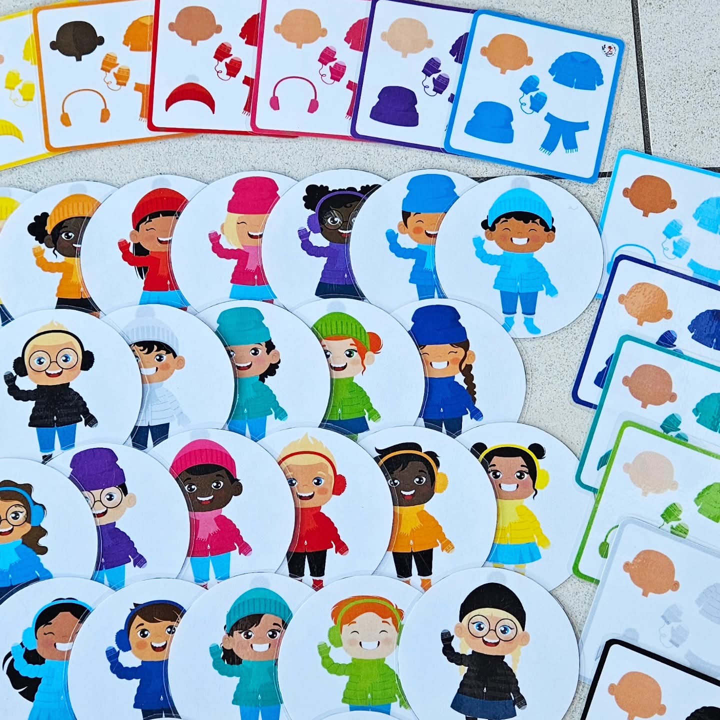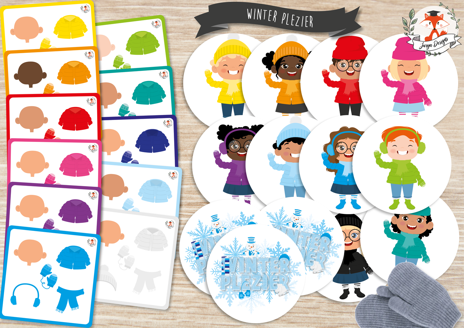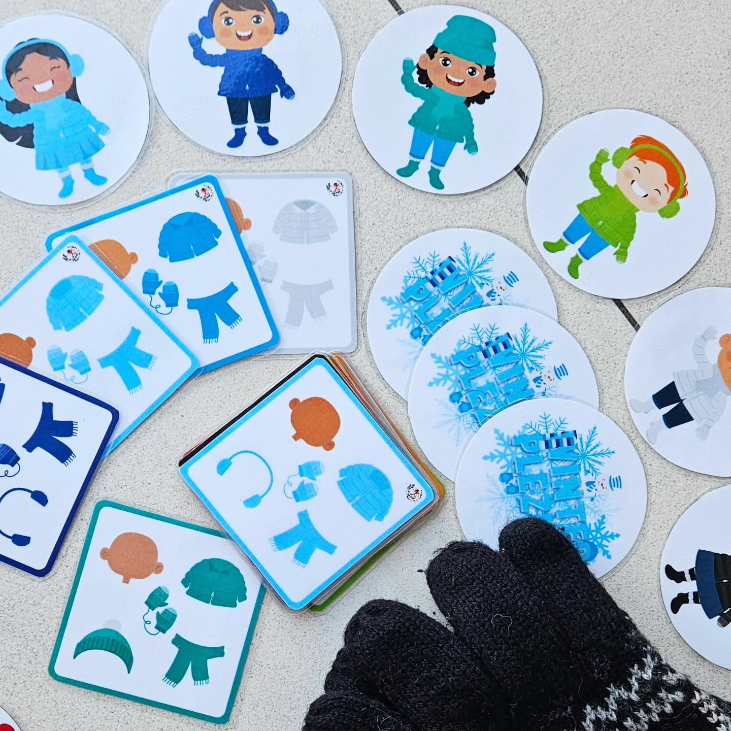 Dit spel kan met 2-4 gespeeld worden. Voor het spel begint schud je de ronde winter kids kaarten goed door elkaar. Plaats ze in een grote cirkel op tafel, met het prentje van de titel naar boven. Maak een omgekeerde stapel van de combinatie kaarten en plaats deze stapel middenin de cirkel + één paar wanten of handschoentjes. De eerste speler mag de bovenste kaart van de stapel openleggen. Elke speler mag tijdens deze ronde elk om beurt 1 kaart uit de cirkel omdraaien. Kijk allemaal naar het winter kindje en de kenmerken: soort winters hooddeksel, huidskleur, kleur winterjas en wanten. Past dit kindje bij het combinatiekaartje die open ligt? Zo ja, snel grijp de wanten! Ben jij de snelste die de wanten heeft gepakt, dan mag jij het combinatiekaartje bijhouden (goed voor 1 punt). Plaats de wanten terug! Het gevonden winter kindje blijft open liggen in de cirkel. Past het kindje niet bij de kaart, dan gaat je beurt voorbij. Draai het kaartje terug om. De combinatiekaart op de stapel blijft open liggen tijdens deze ronde. Wordt het juiste winter kindje niet gevonden, dan gaat de combinatiekaart terug onderaan de stapel. Ga zo door tot je alle winter kindjes hebt gevonden. De speler die de meeste kaarten heeft verzameld en dus de meeste punten is de winnaar! Klaar voor de winter bibbers.